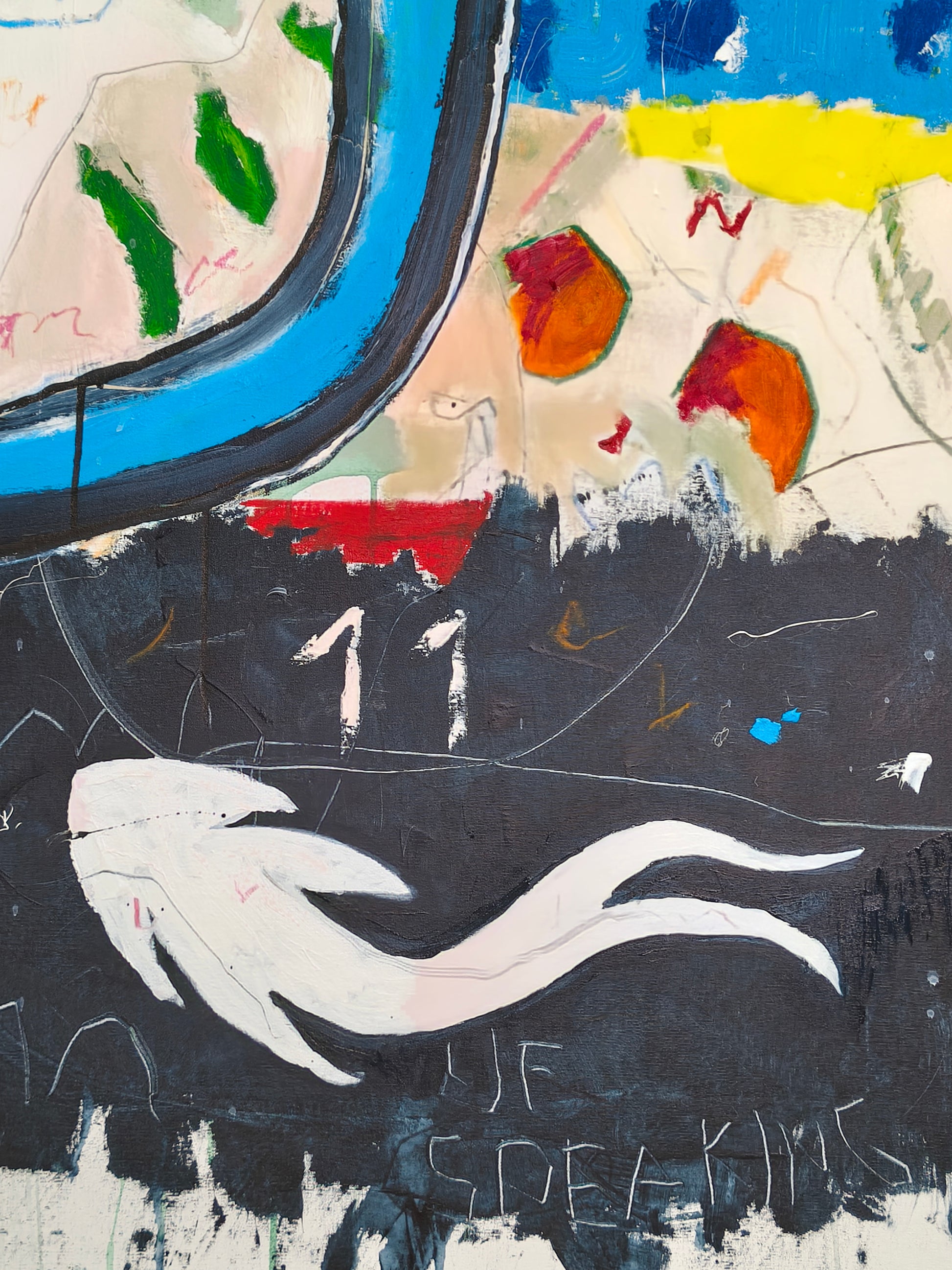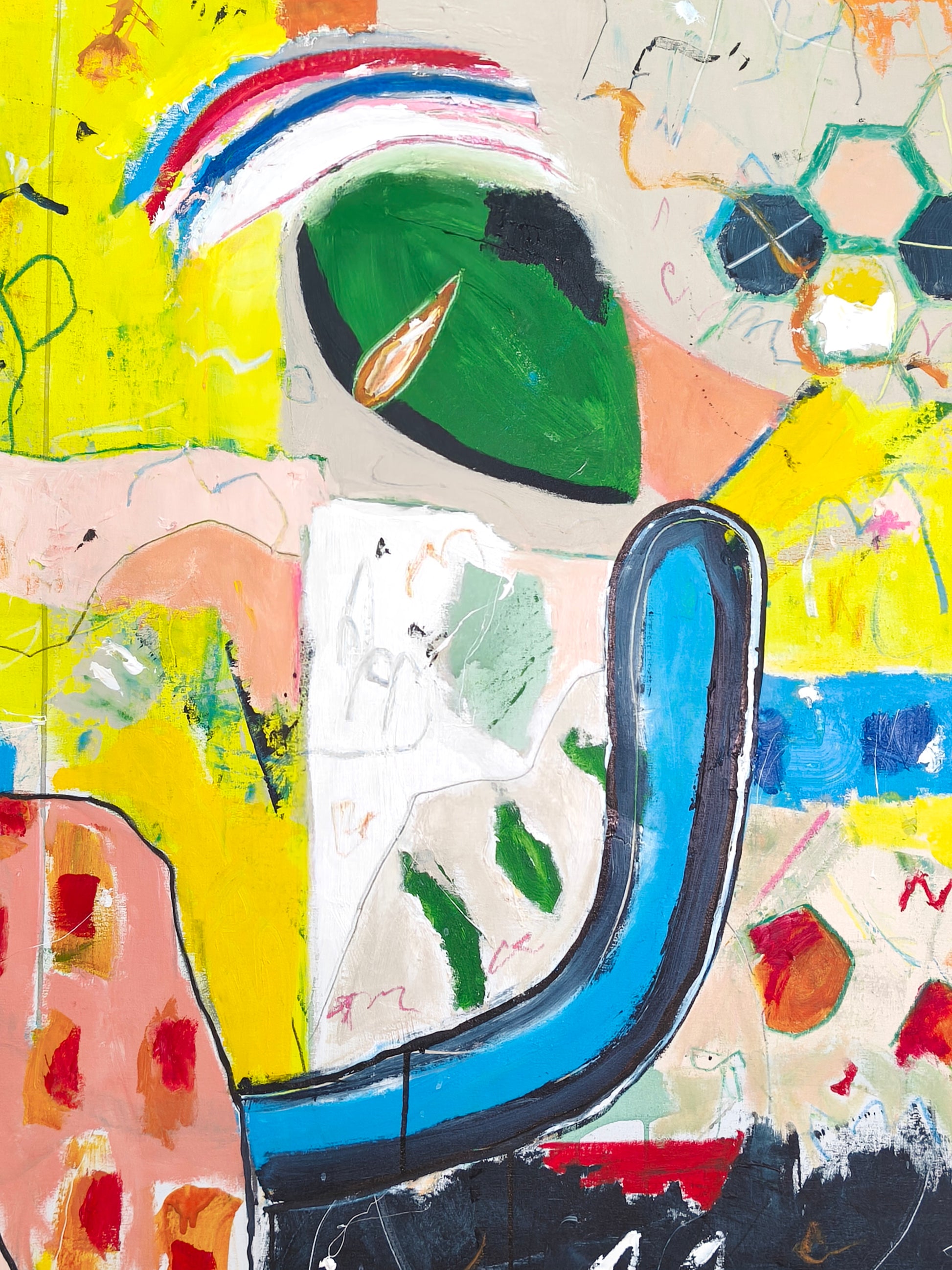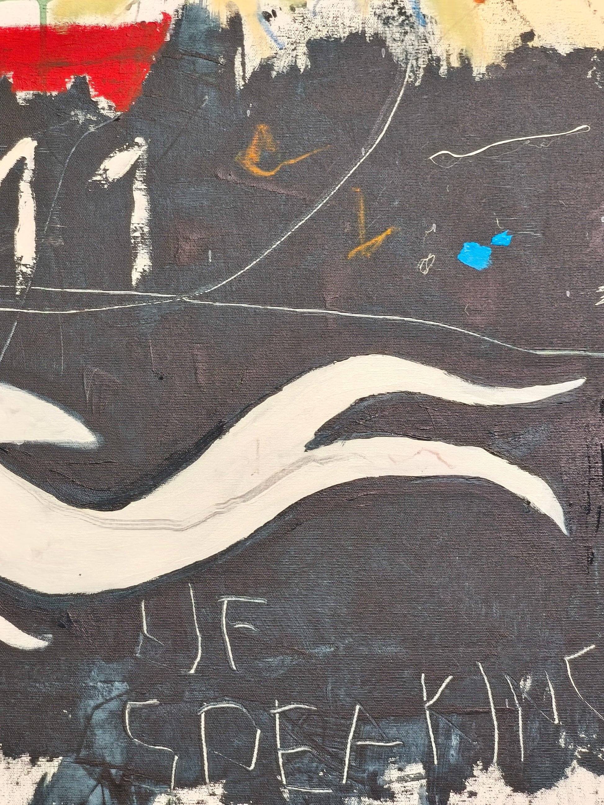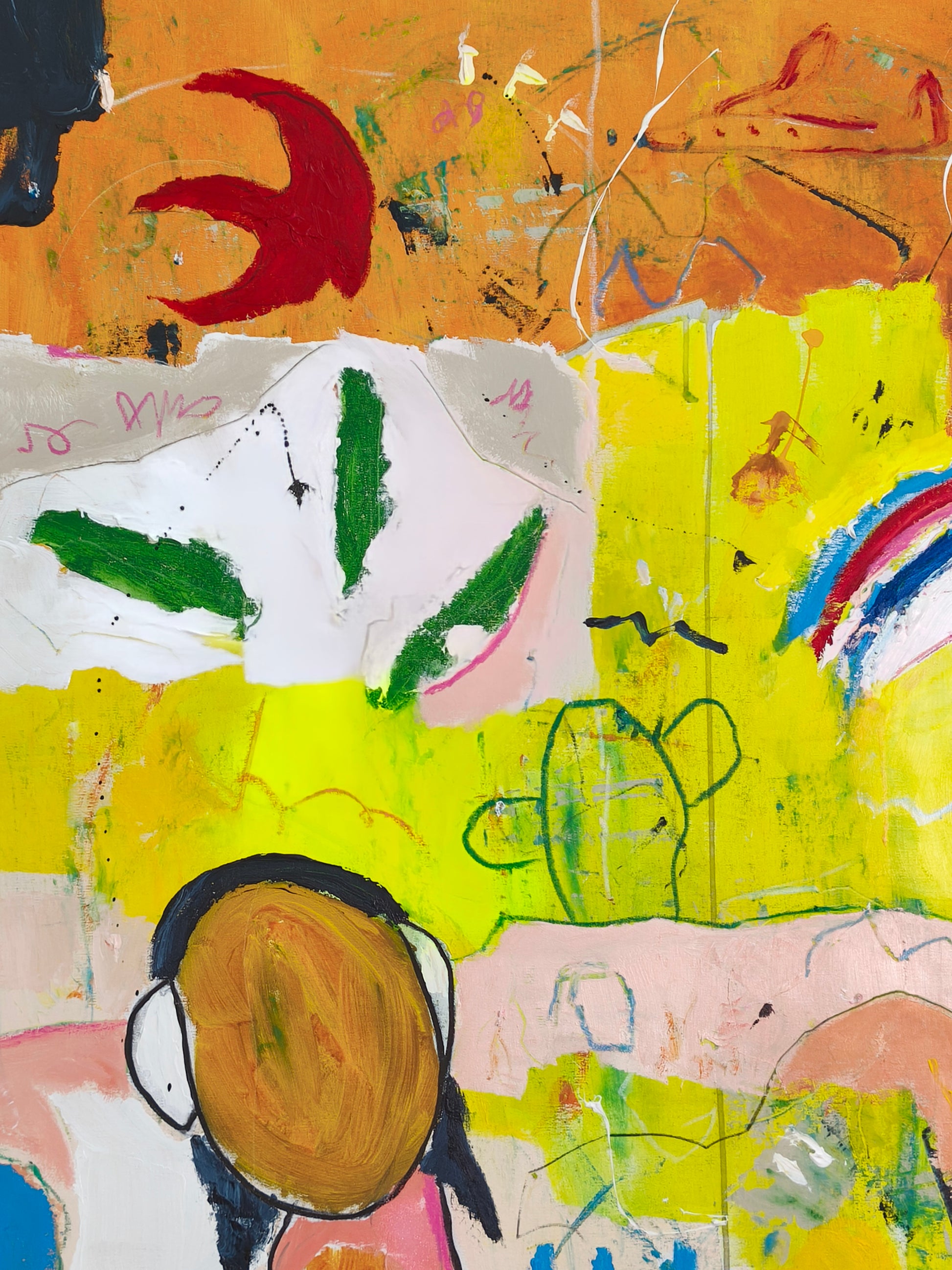 Pintura gestual, intuitiva, que deja que las cosas pasen y se apoya sobre lo que aparece. Aprovechando el accidente y aceptando las consecuencias.