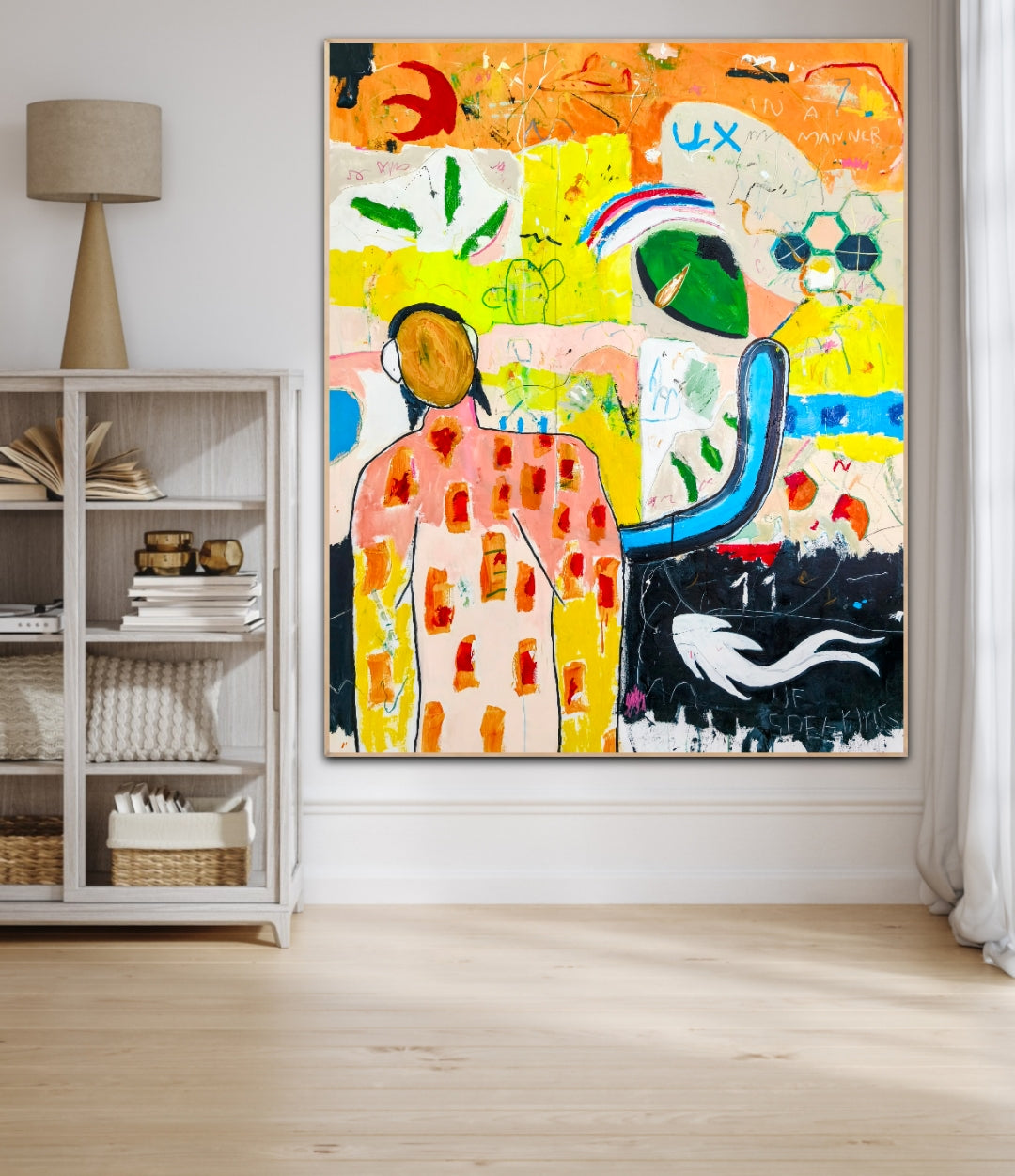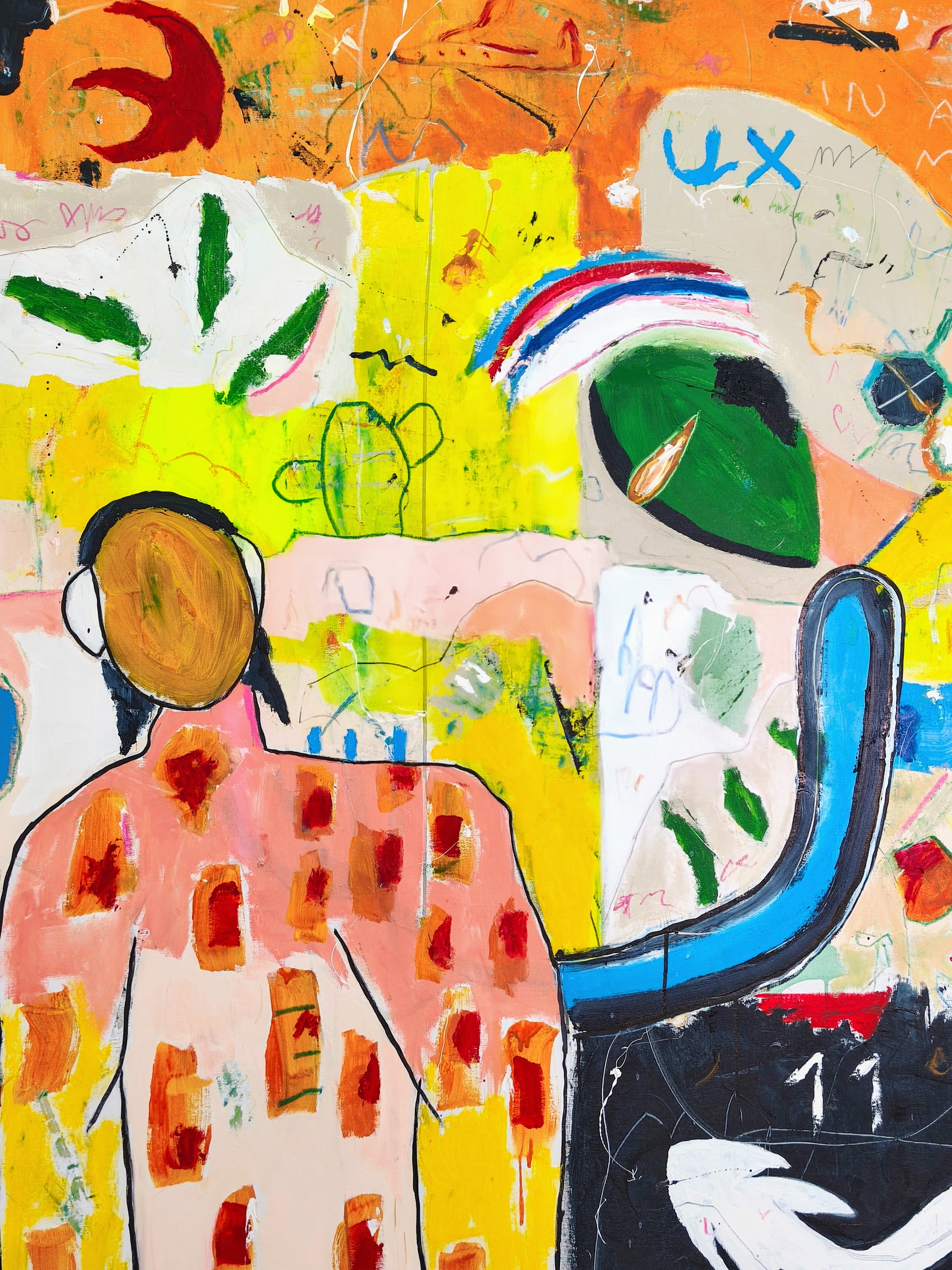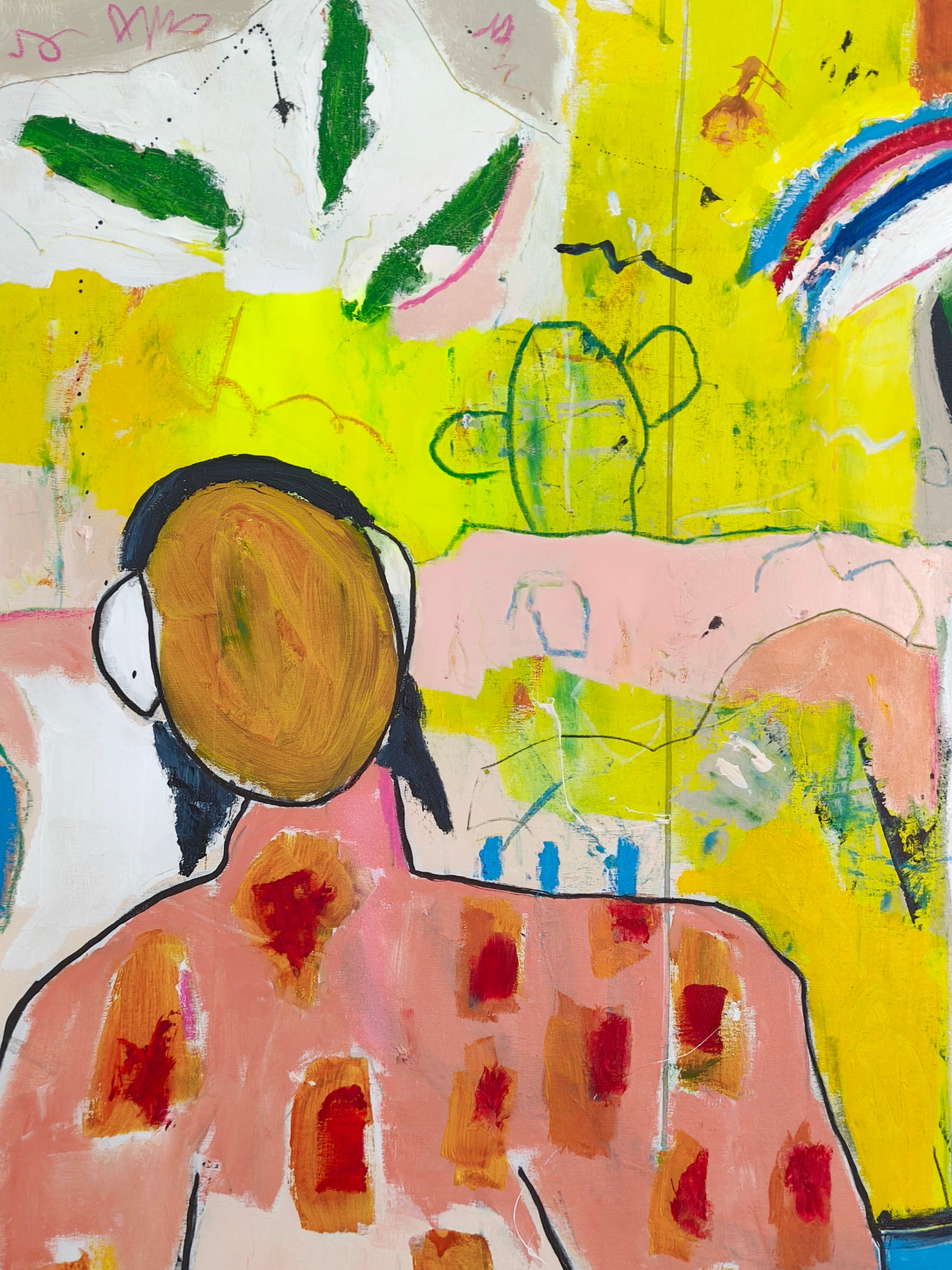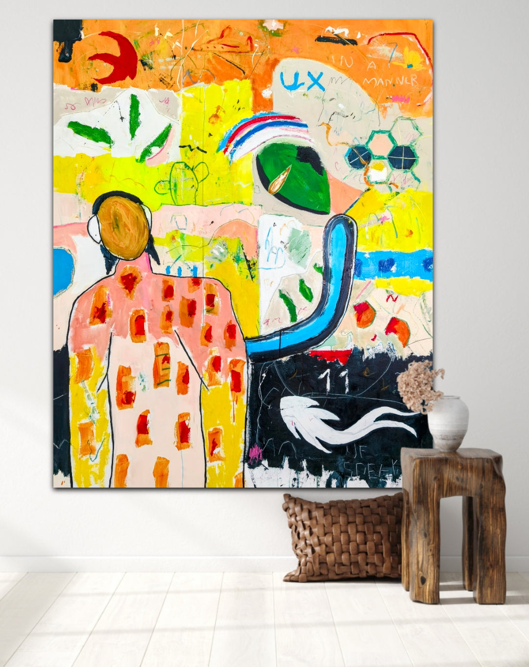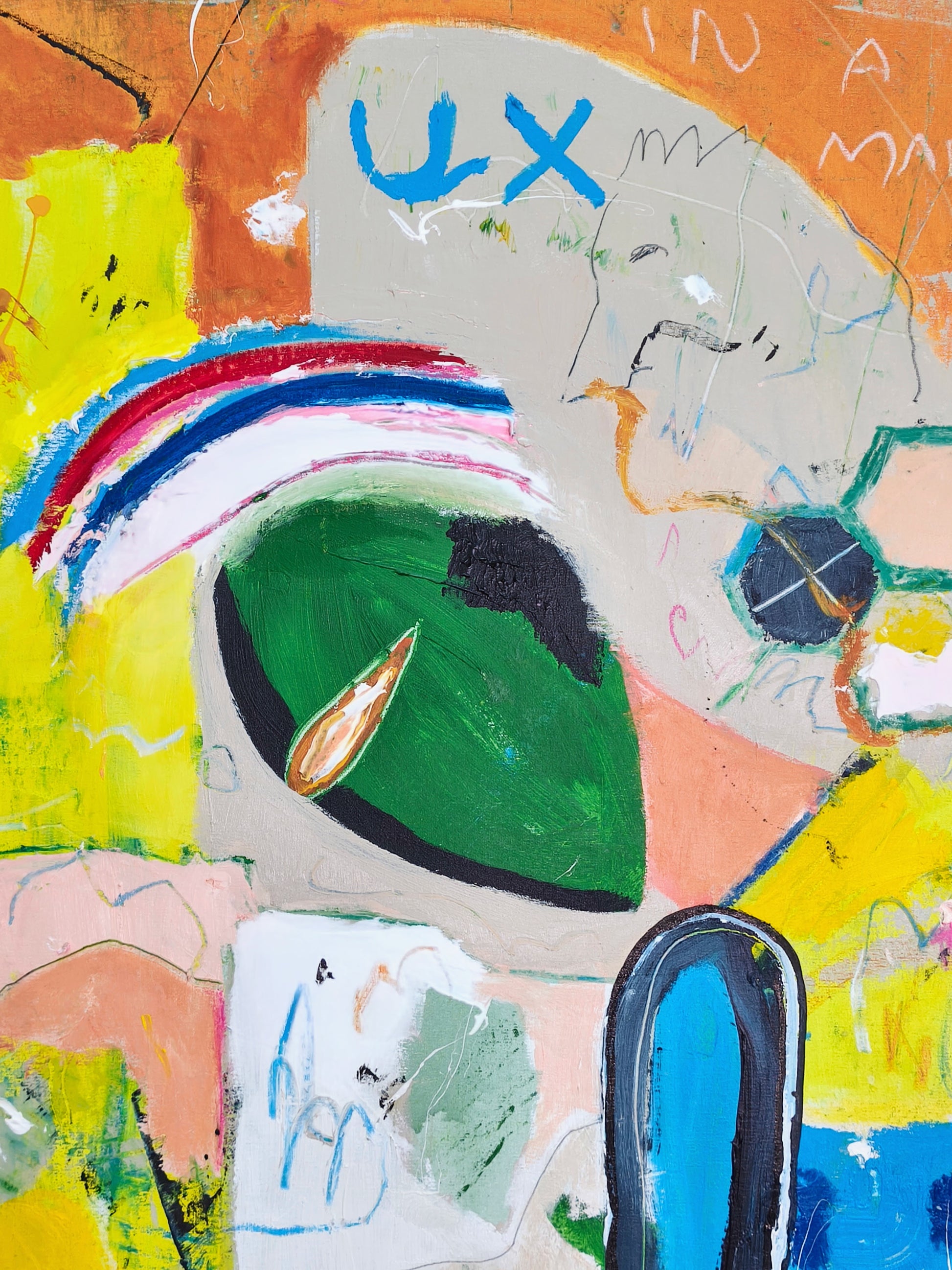 Pintura gestual, intuitiva, que deja que las cosas pasen y se apoya sobre lo que aparece. Aprovechando el accidente y aceptando las consecuencias.
