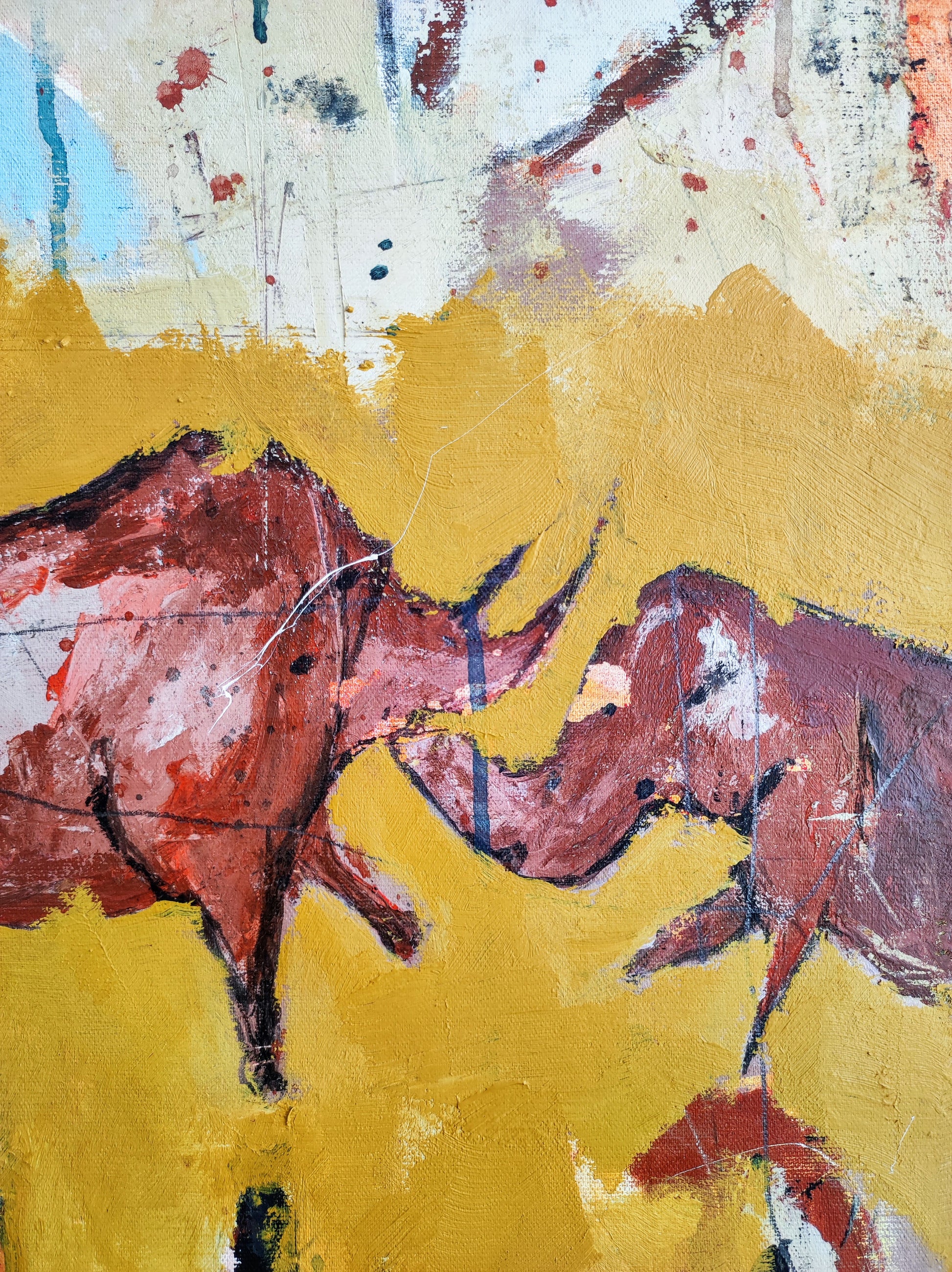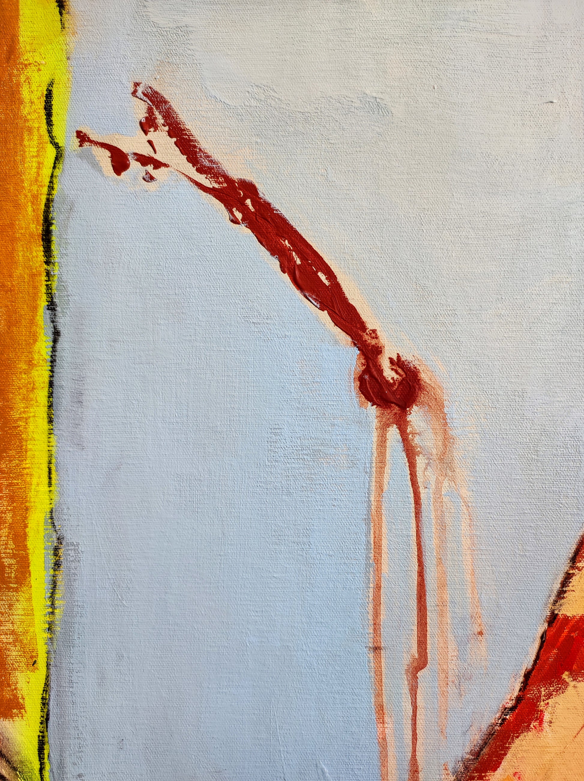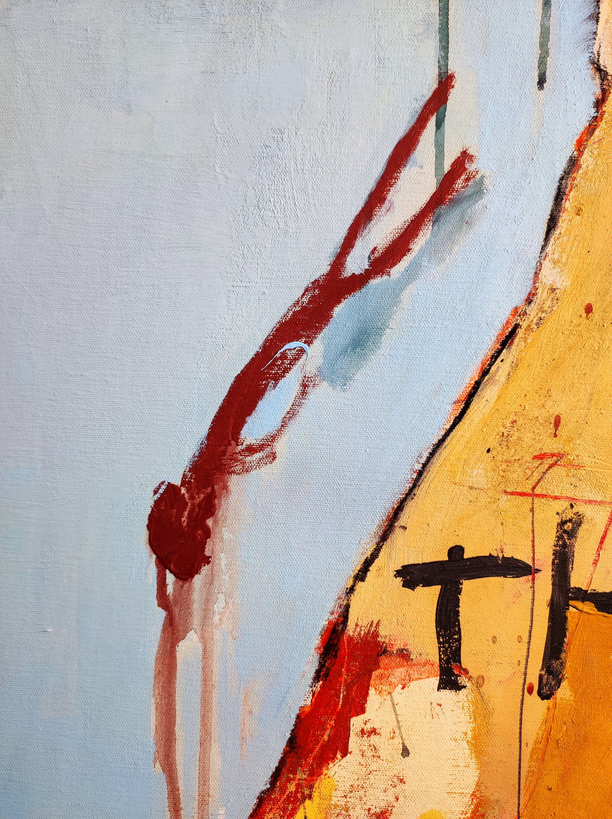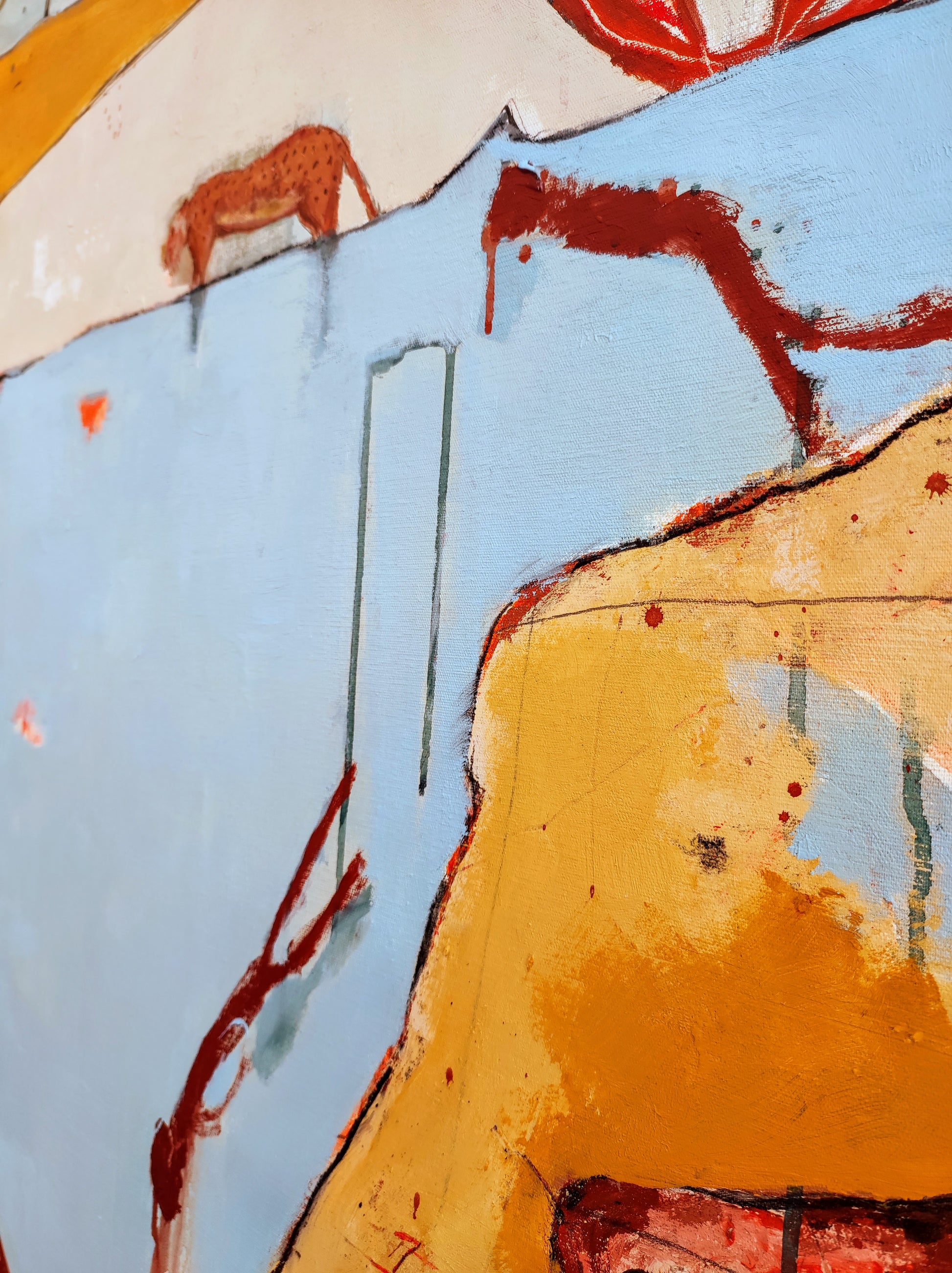 Pintura gestual, intuitiva, que deja que las cosas pasen y se apoya sobre lo que aparece. Aprovechando el accidente y aceptando las consecuencias.