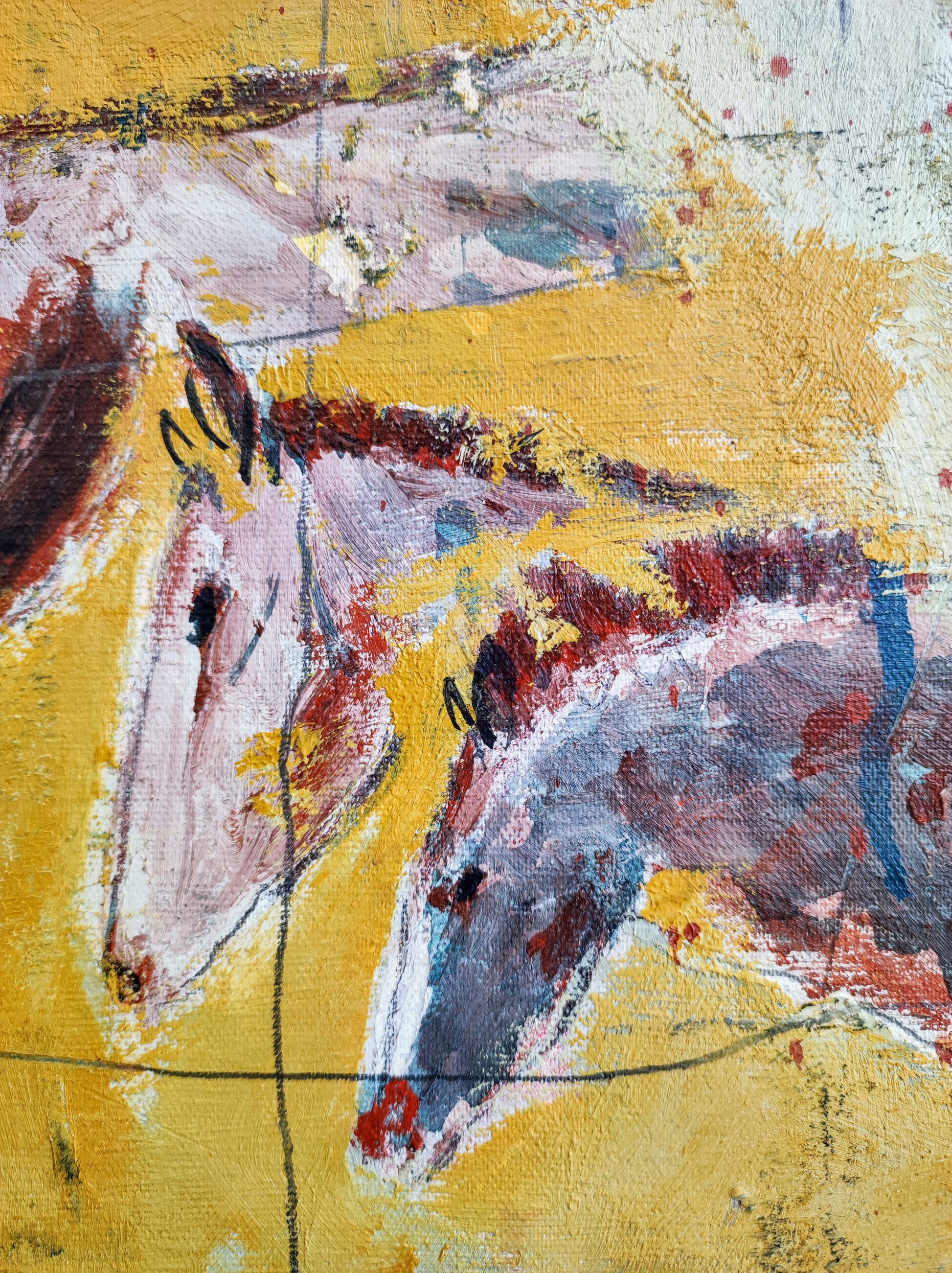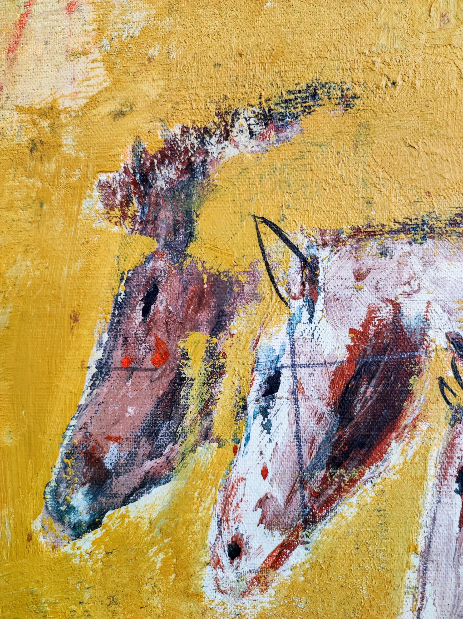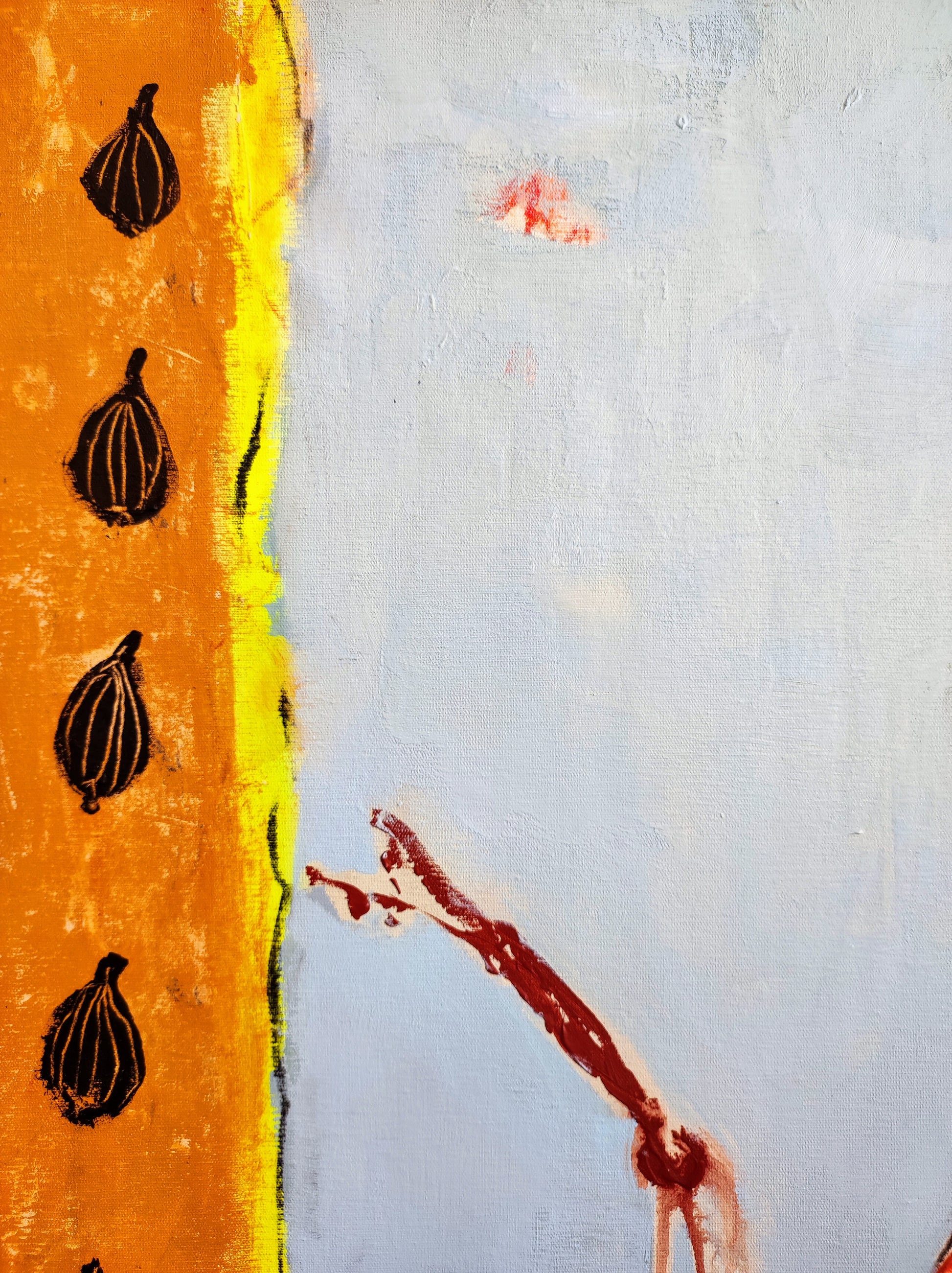 Pintura gestual, intuitiva, que deja que las cosas pasen y se apoya sobre lo que aparece. Aprovechando el accidente y aceptando las consecuencias.