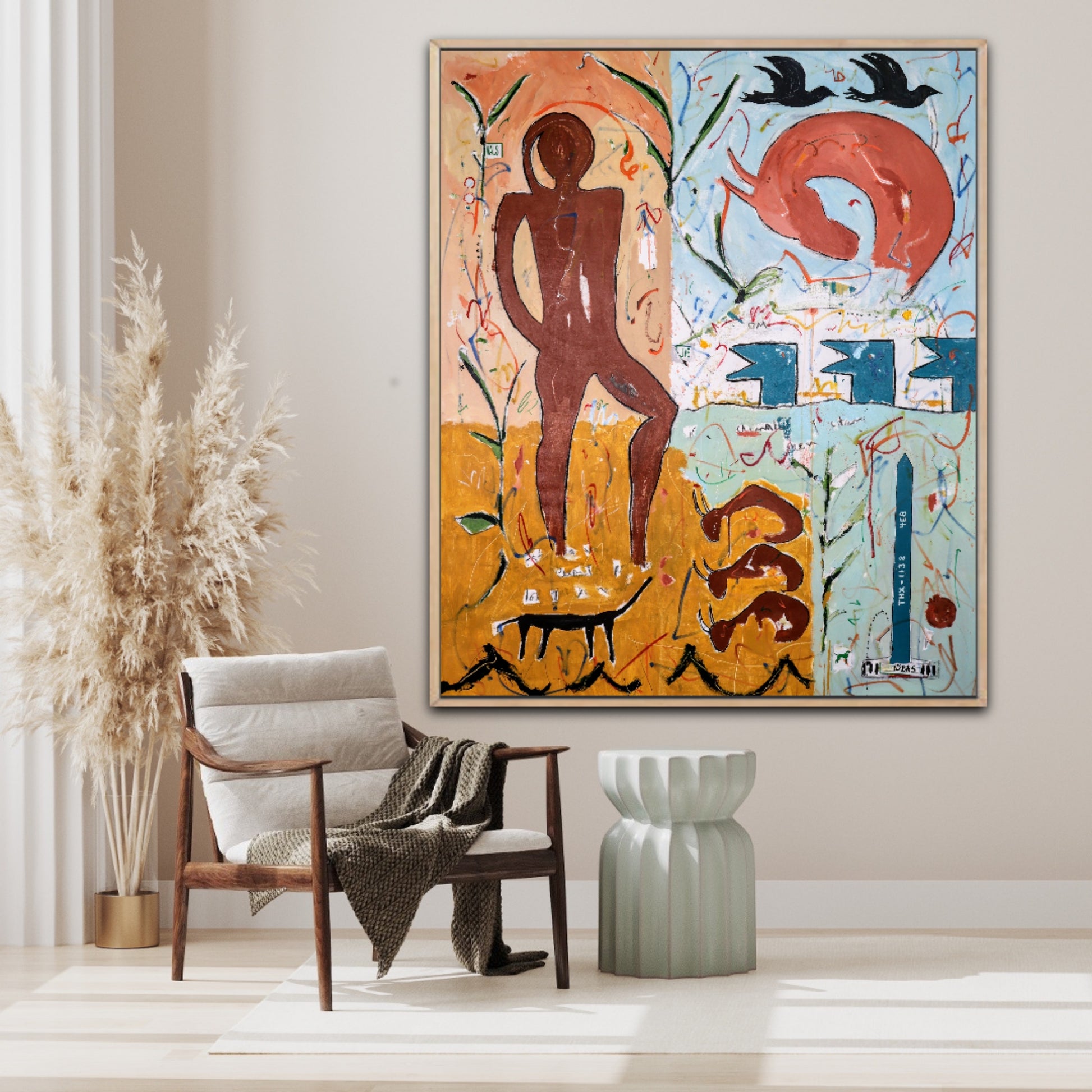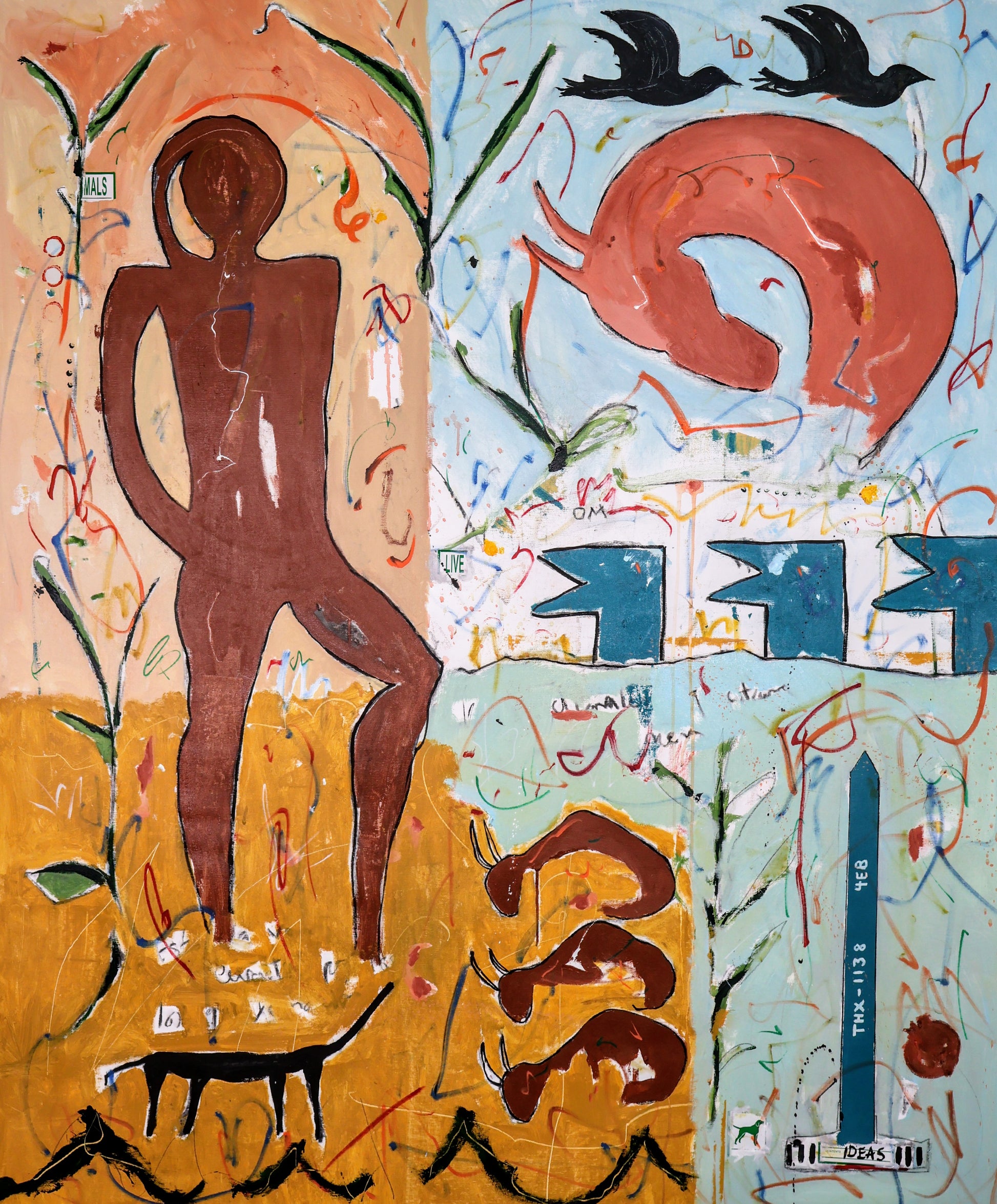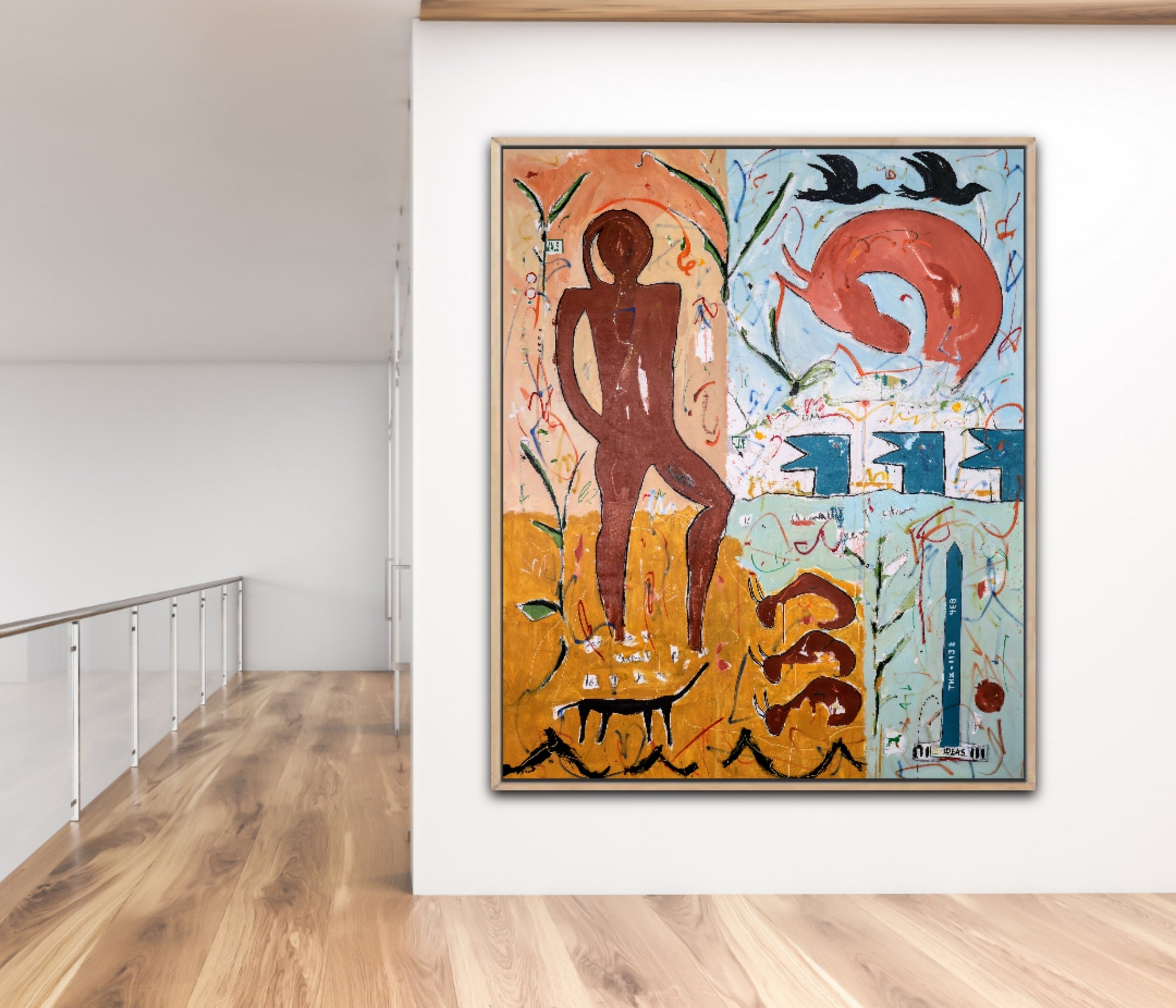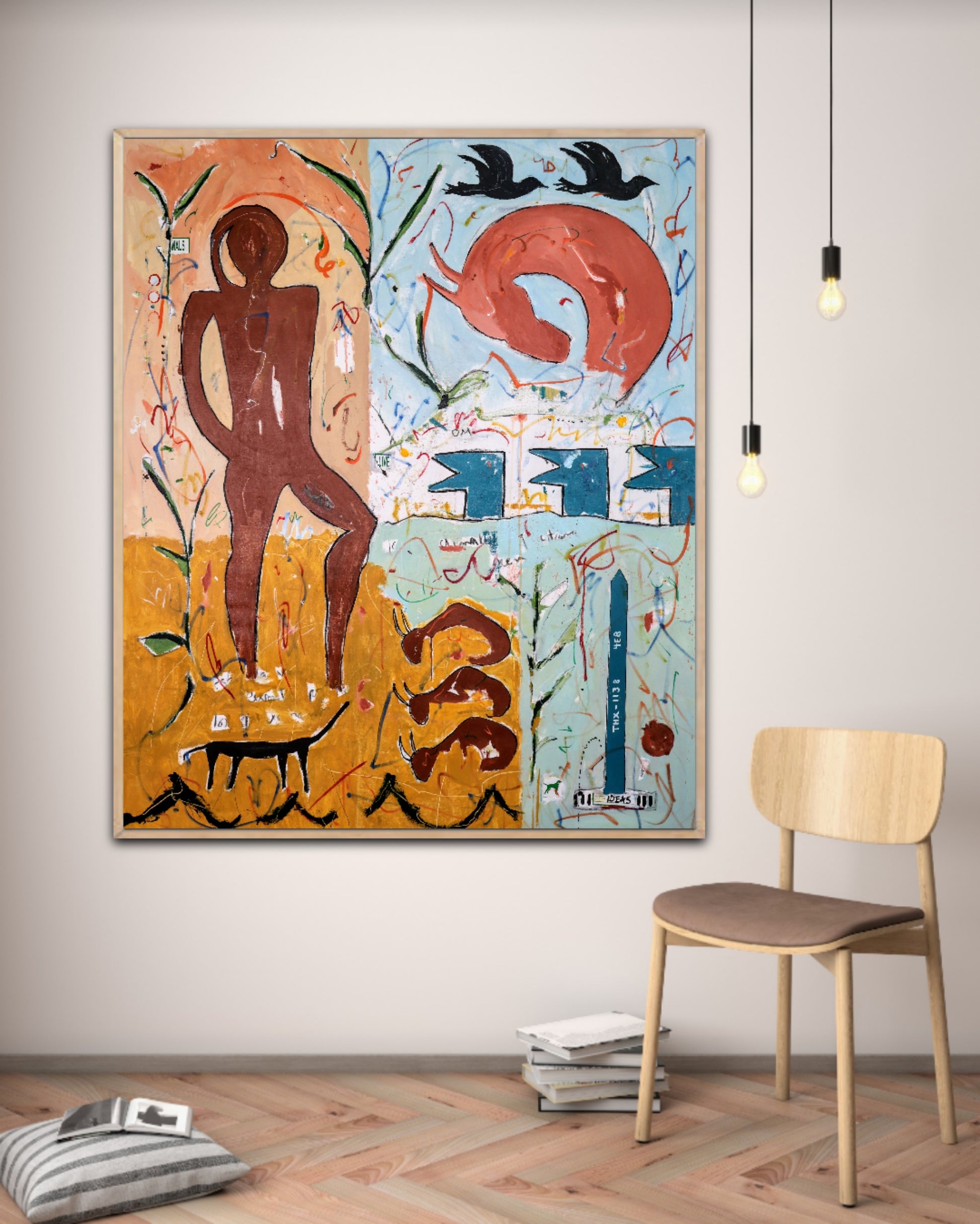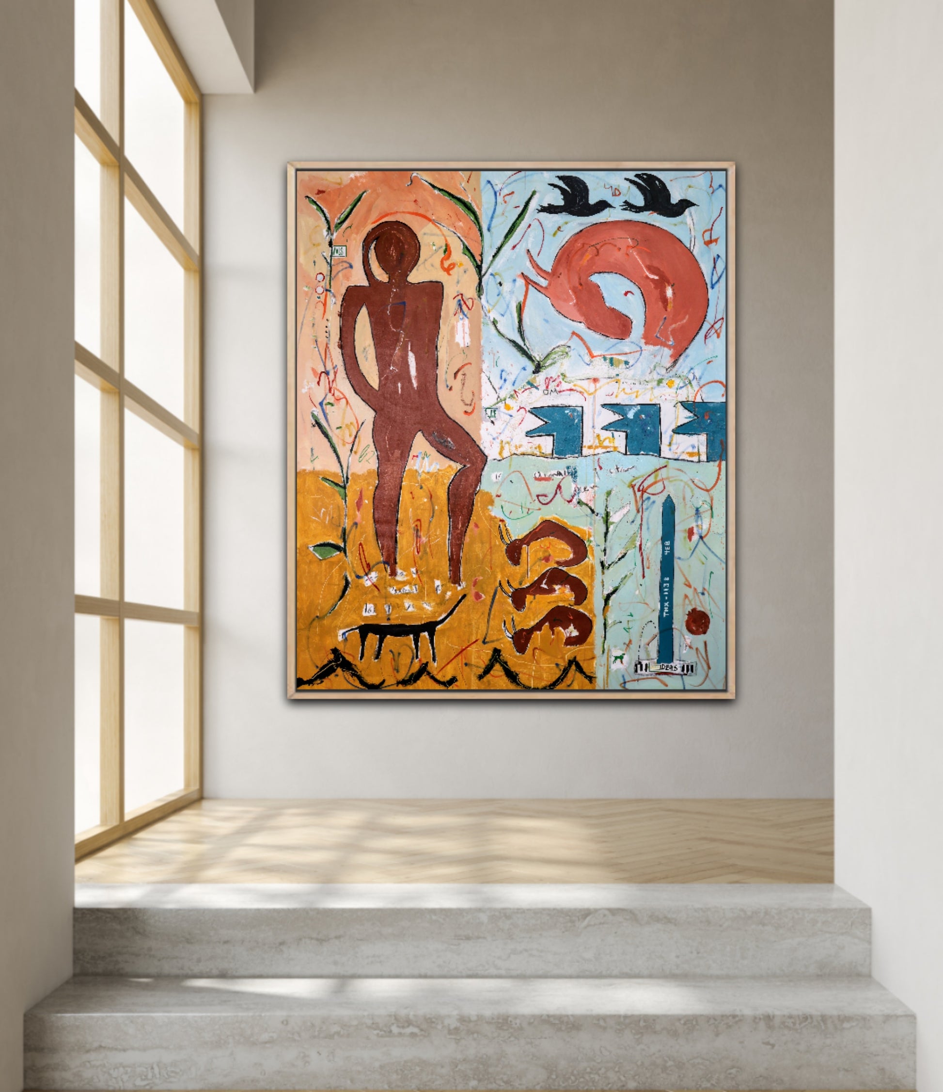 Técnica: acrílico, pigmentos, témpera, lápiz, carboncillo y pastel.