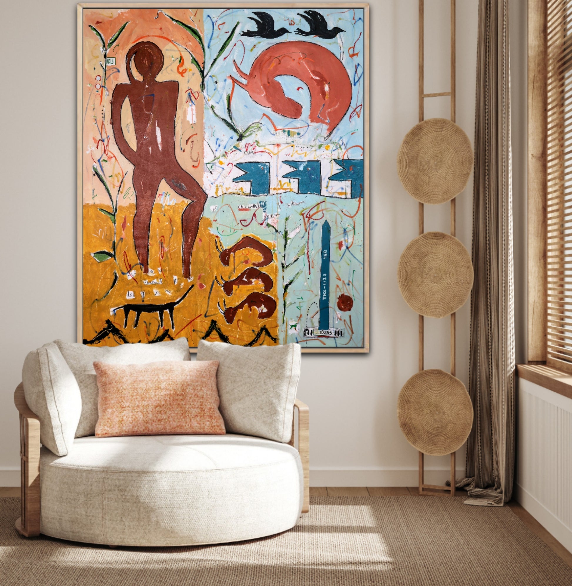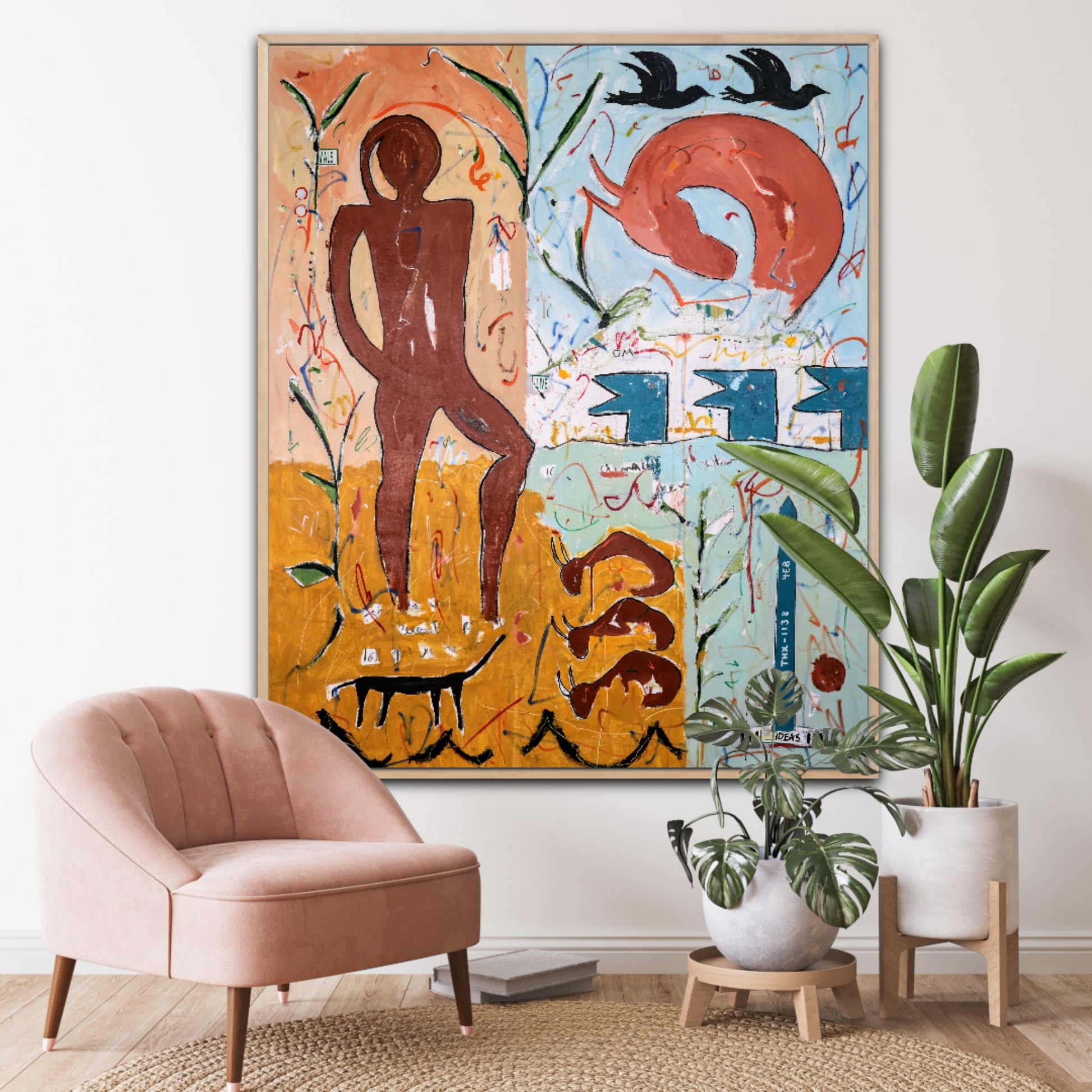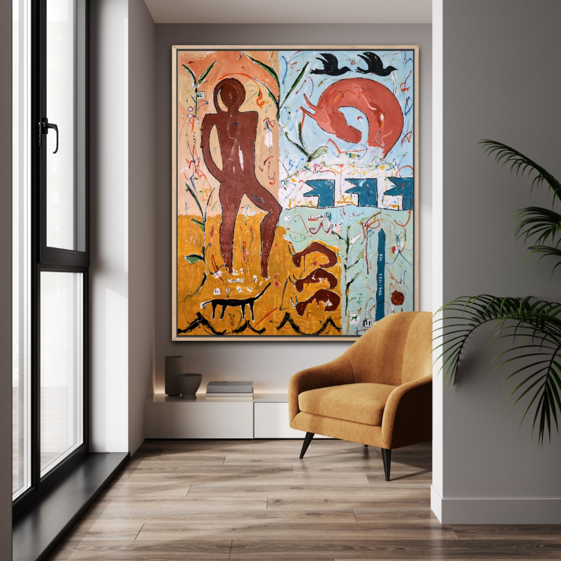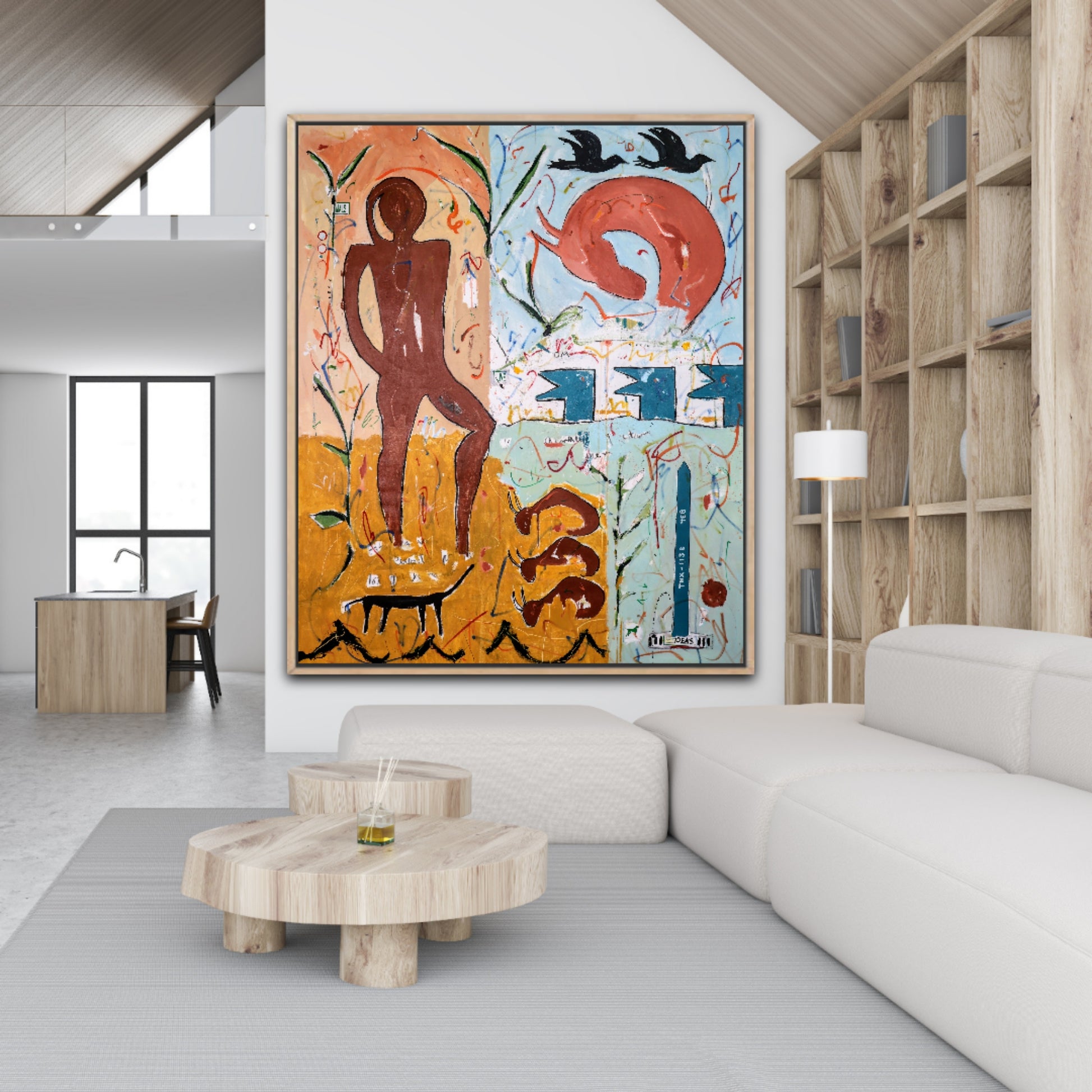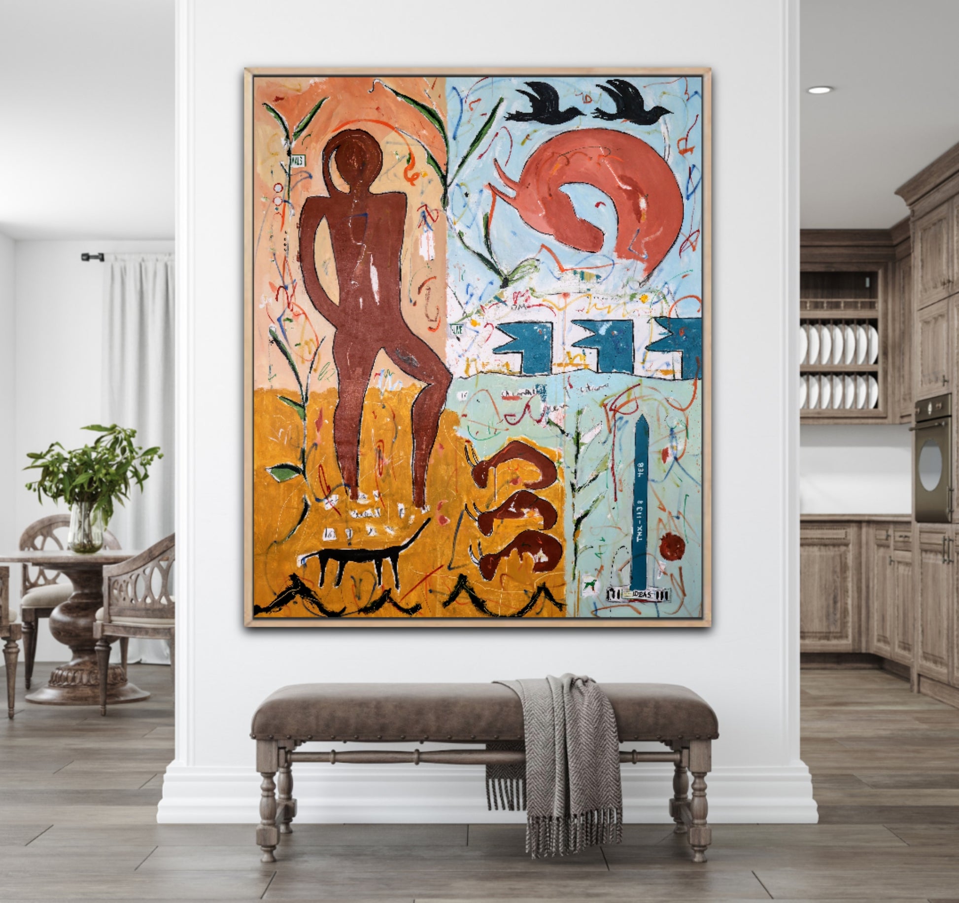 Técnica: acrílico, pigmentos, témpera, lápiz, carboncillo y pastel.