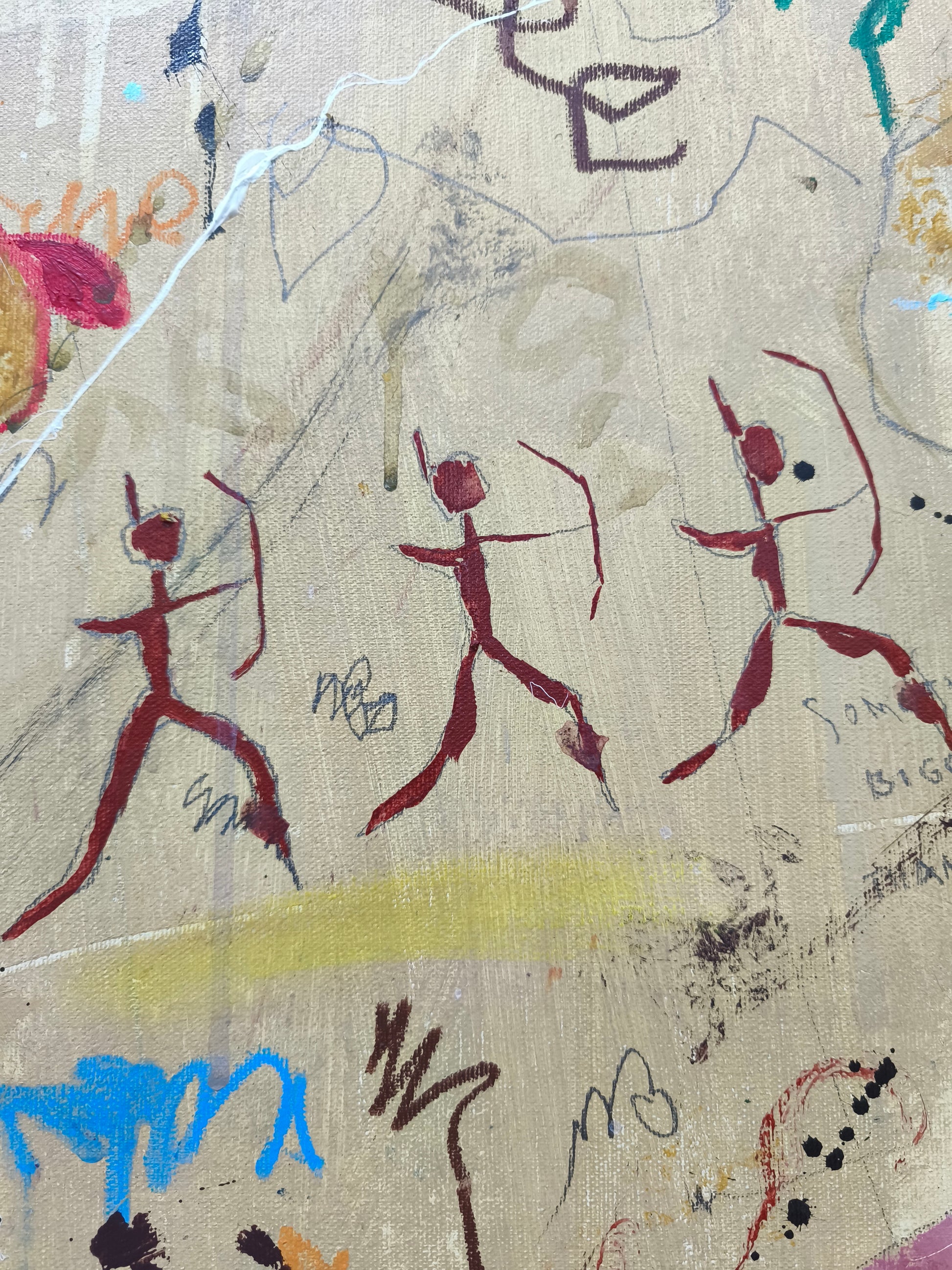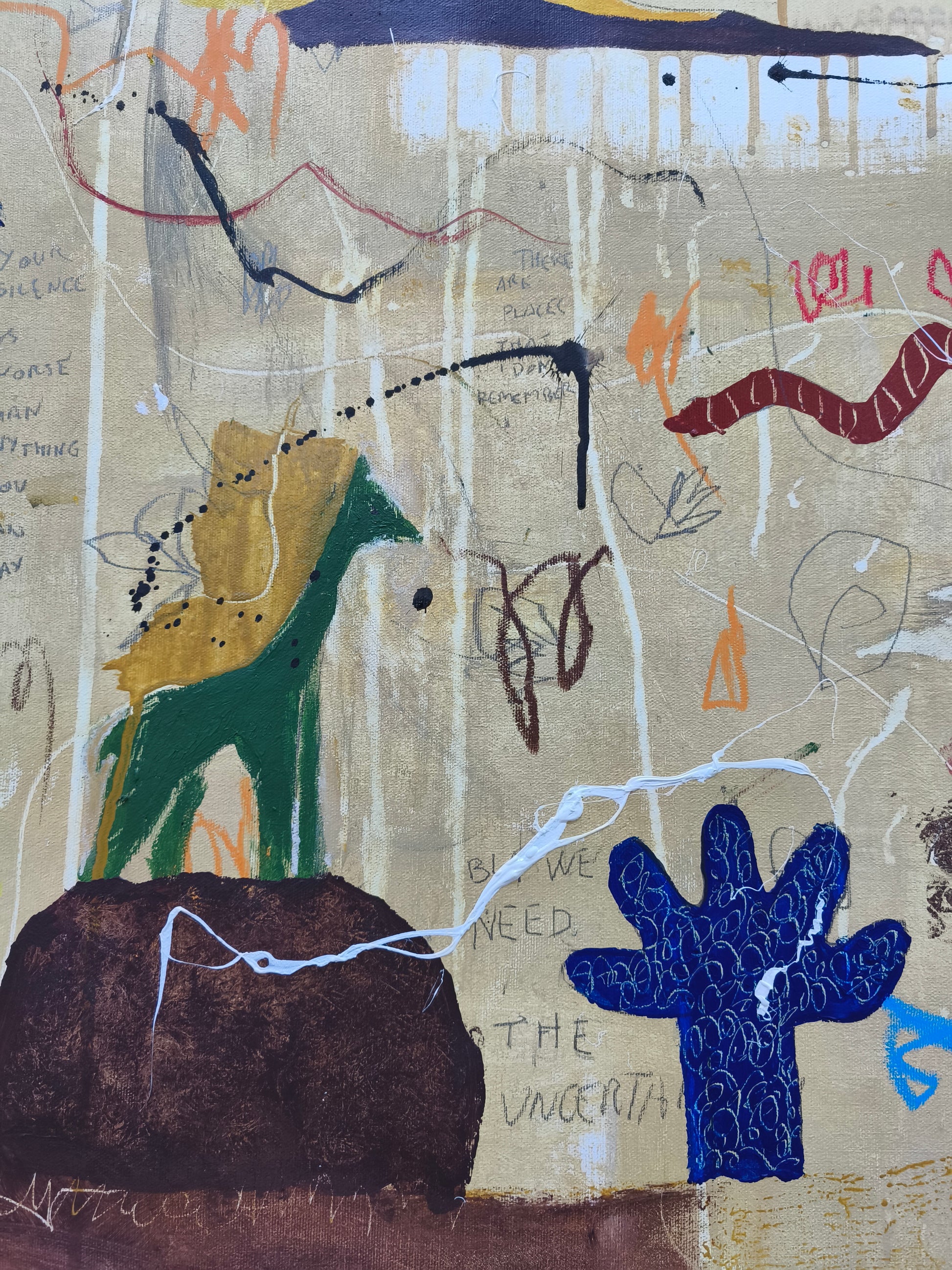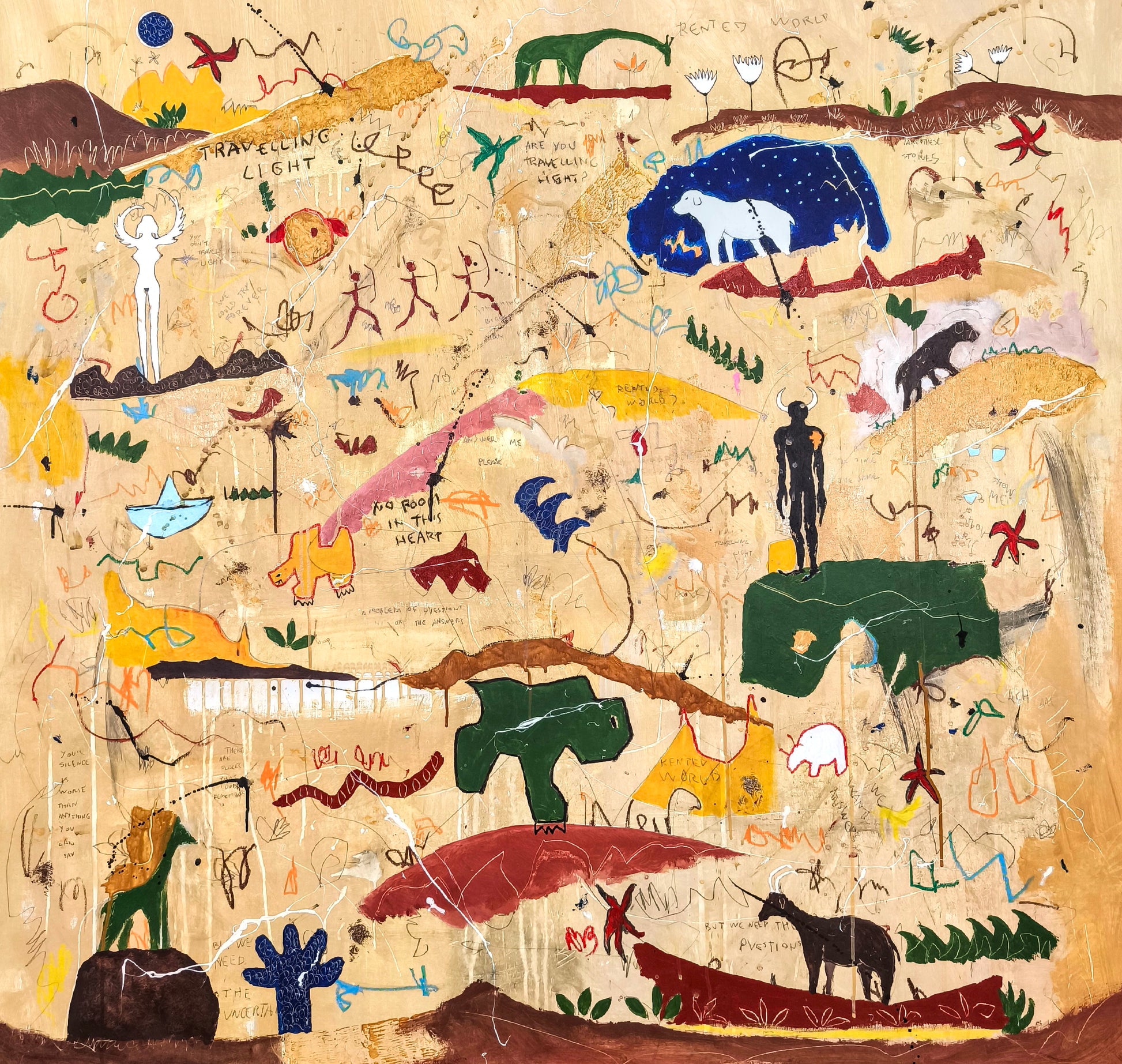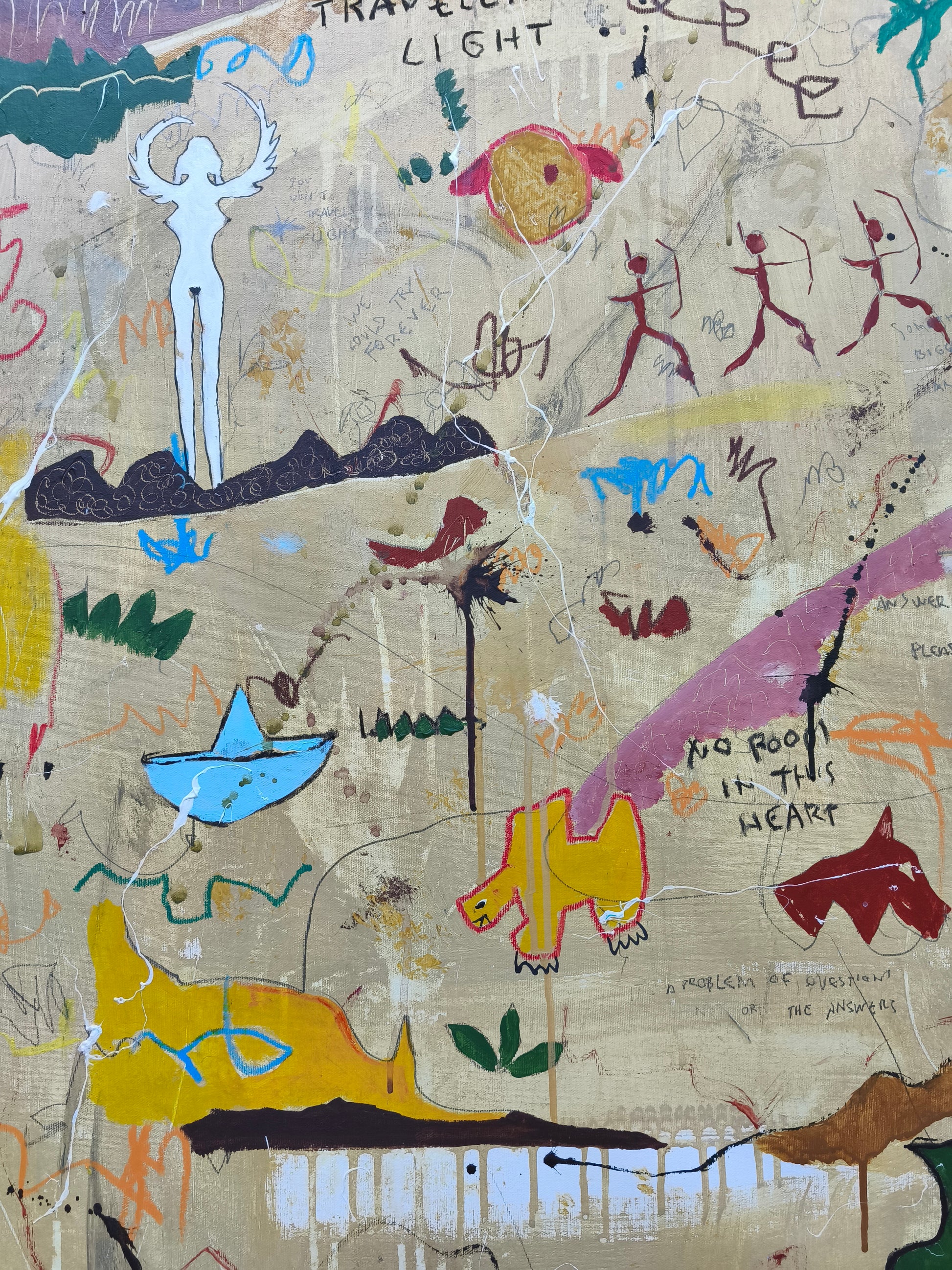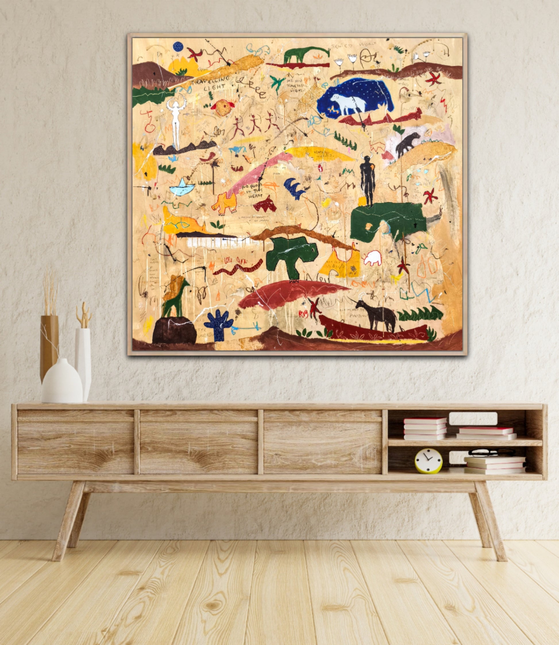 Técnica: acrílico, pigmentos, lápiz, ceras, carboncillo, tinta china y gesso.