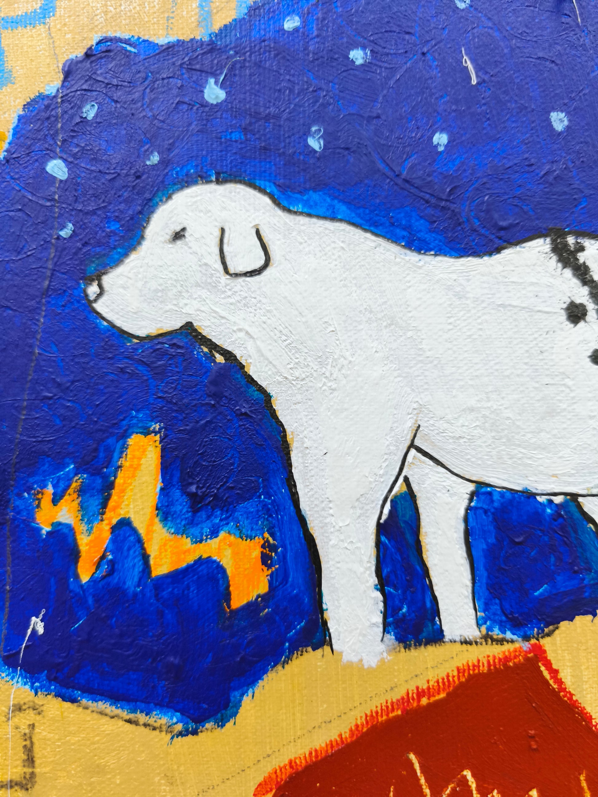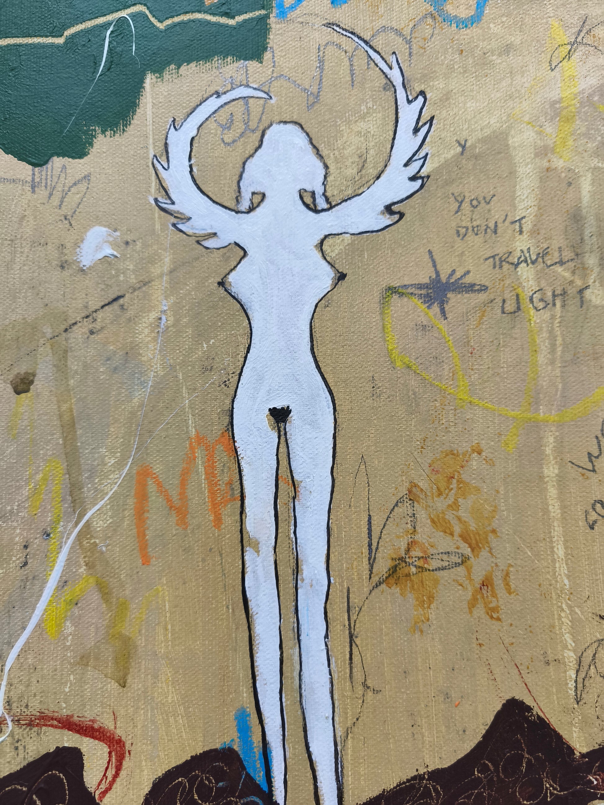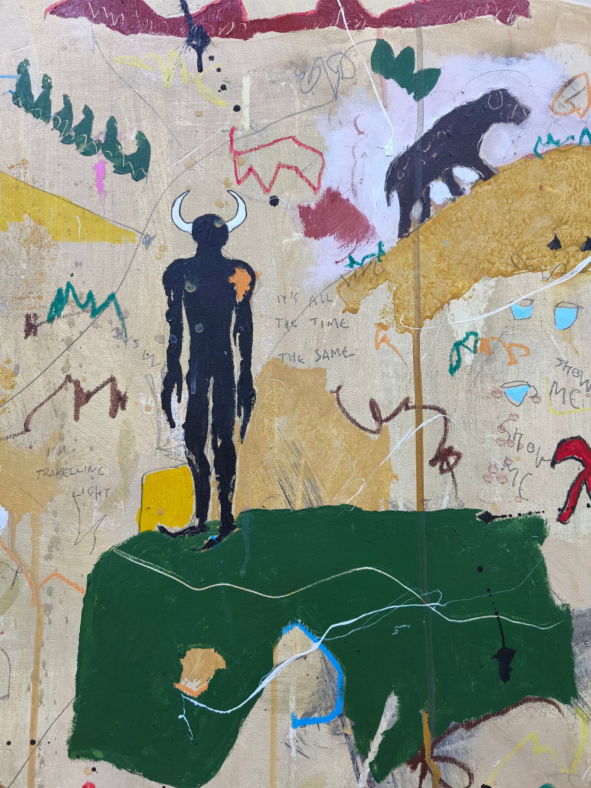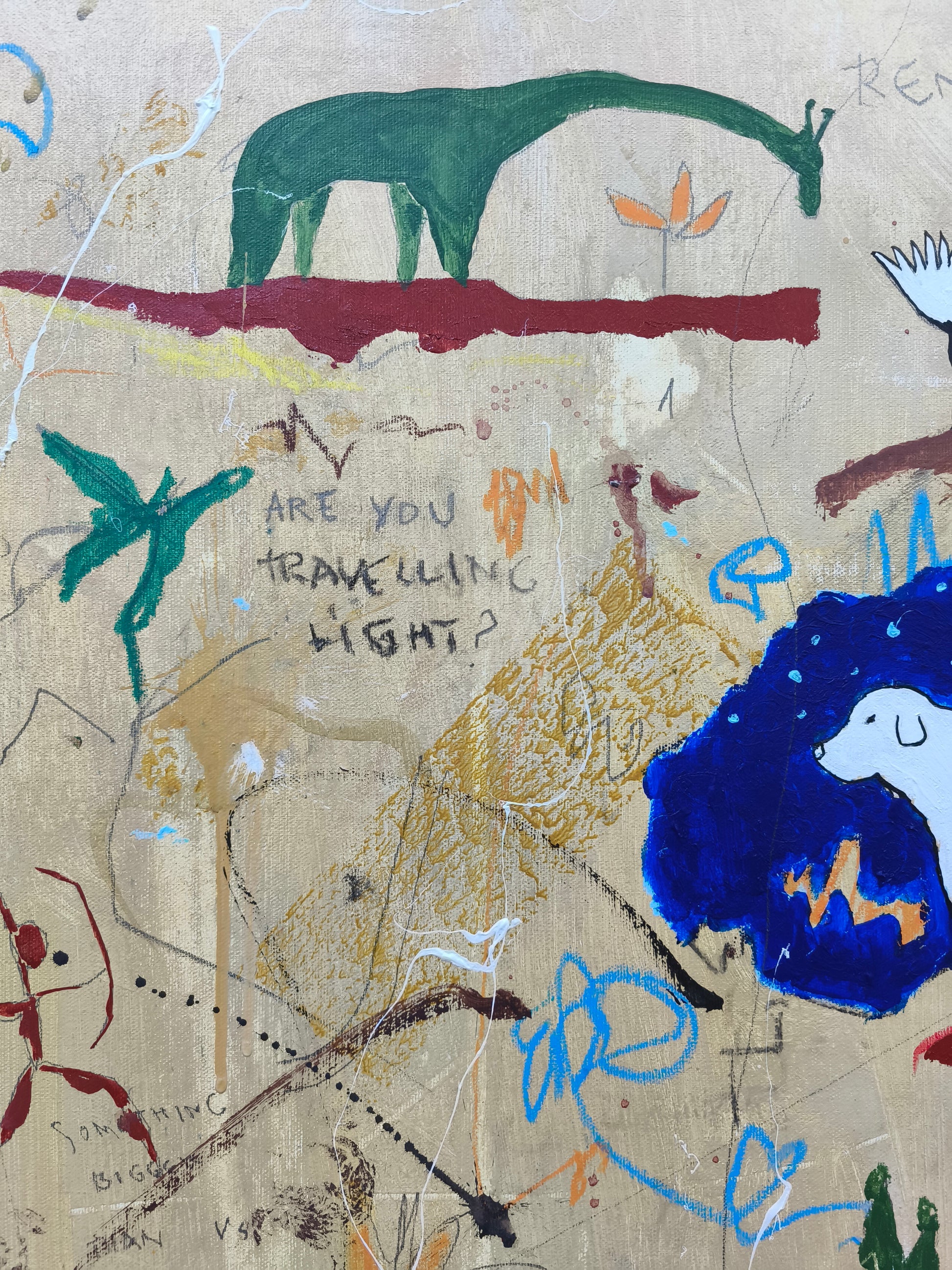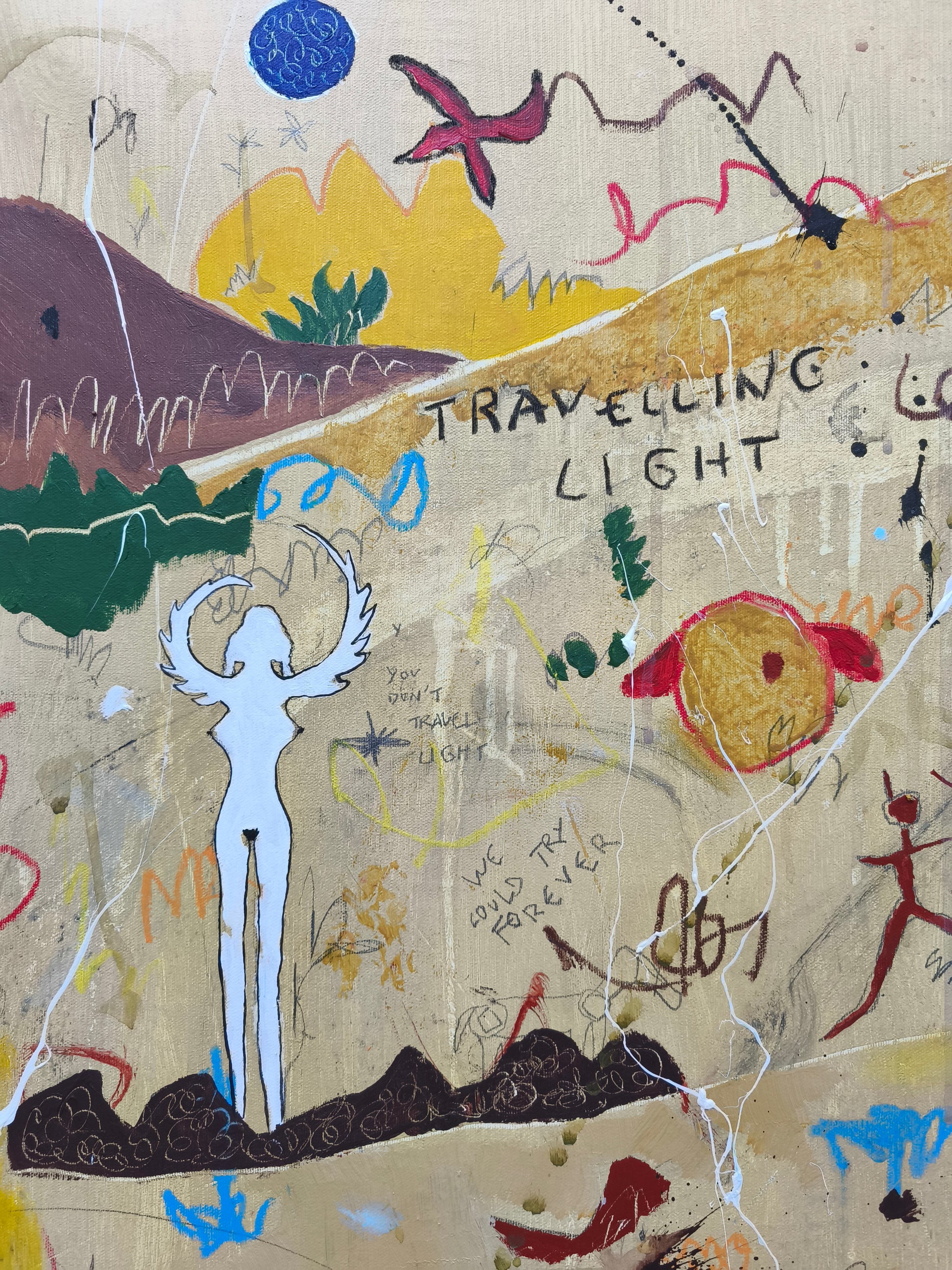 Cuadro trabajado desde la improvisación libre. Action painting con música de Tindersticks (especialmente el tema "Travelling light" que suena en bucle durante gran parte de la ejecución de la obra).