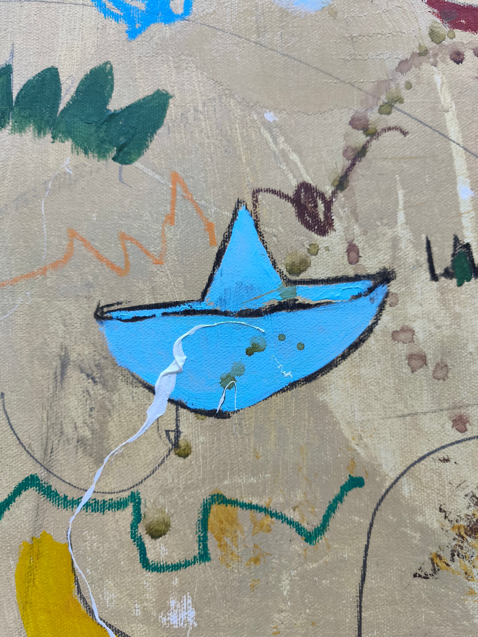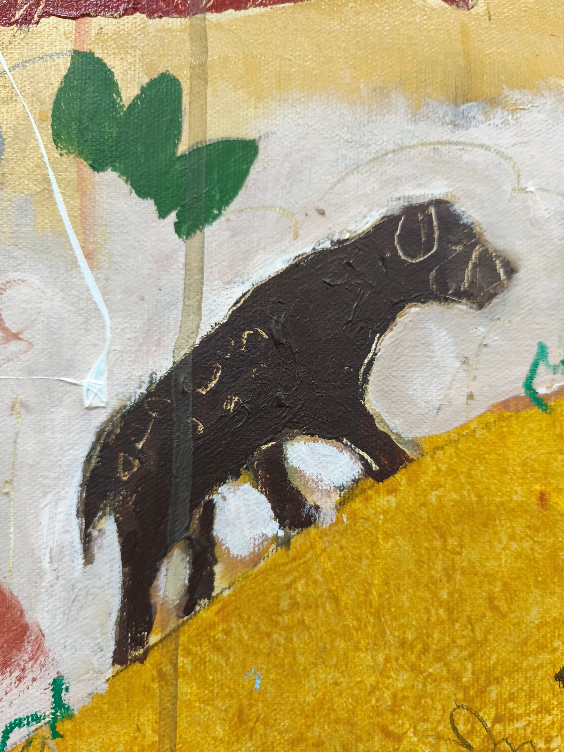 Pintura gestual, intuitiva, que deja que las cosas pasen y se apoya sobre lo que aparece. Aprovechando el accidente y aceptando las consecuencias.