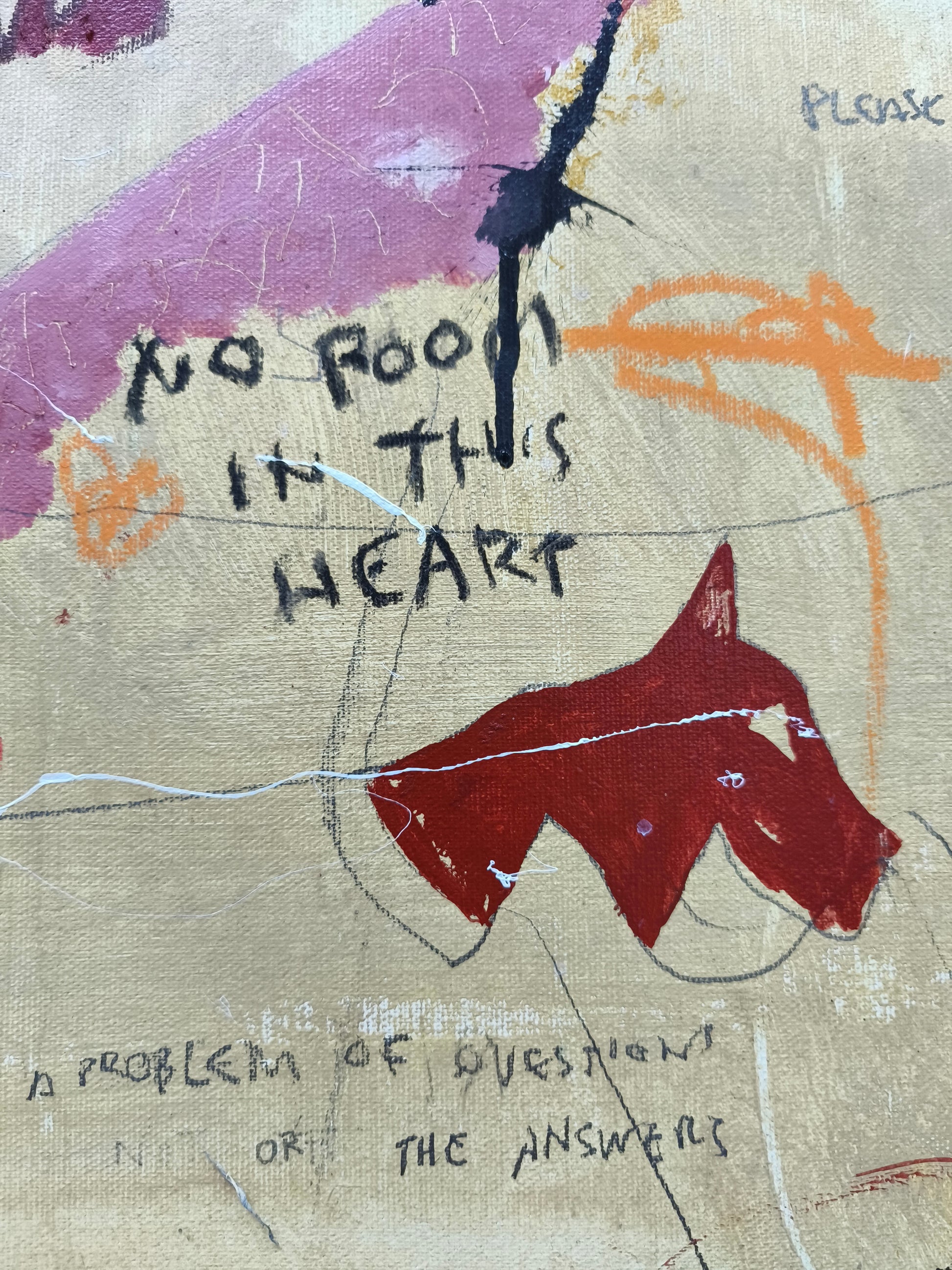 Trabajo por capas, donde lo nuevo tapa lo viejo pero siempre queda un rastro. Dibujos antiguos, dibujos de niño, pintadas, frases y marcas construyen una historia inesperada. Las partes encajan sin pretensión, sin forzar, solapándose a veces.