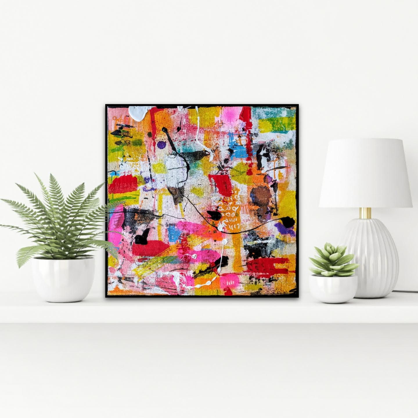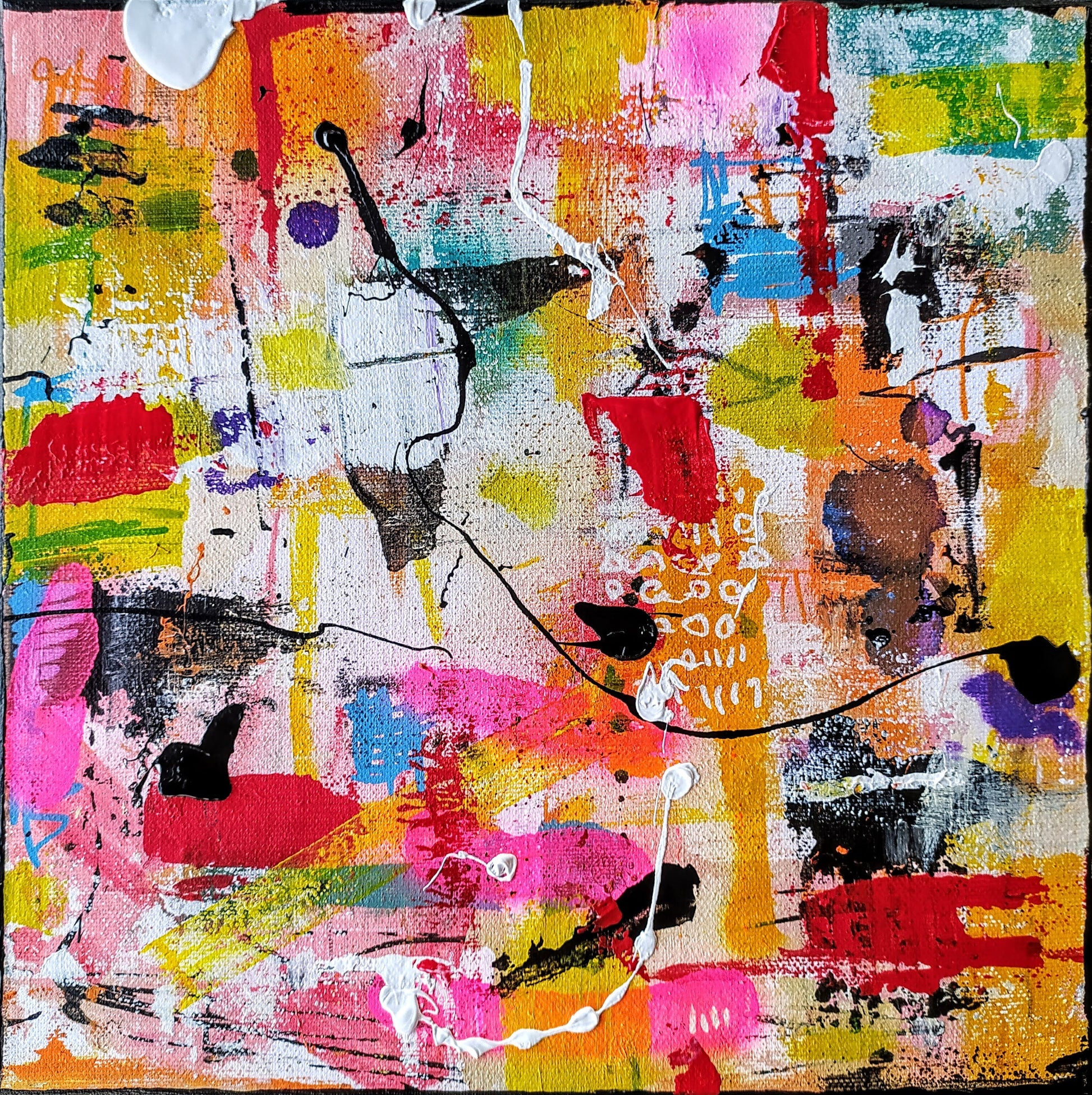 Obra perteneciente a la serie "Vivo". 4 obras creadas con múltiples capas, sobre una base de colores ocres, rosas y rojos. Marcas, driping y simbología variada dan forma a composiciones cálidas y contundentes.