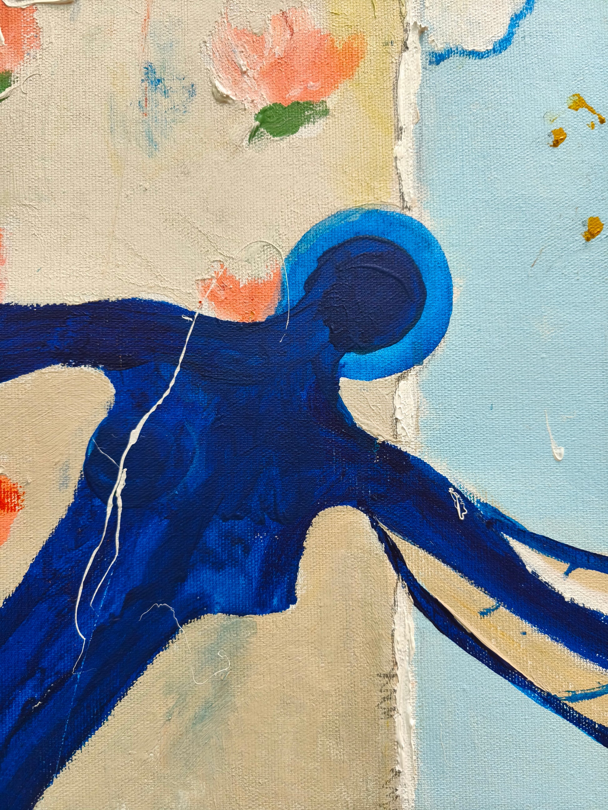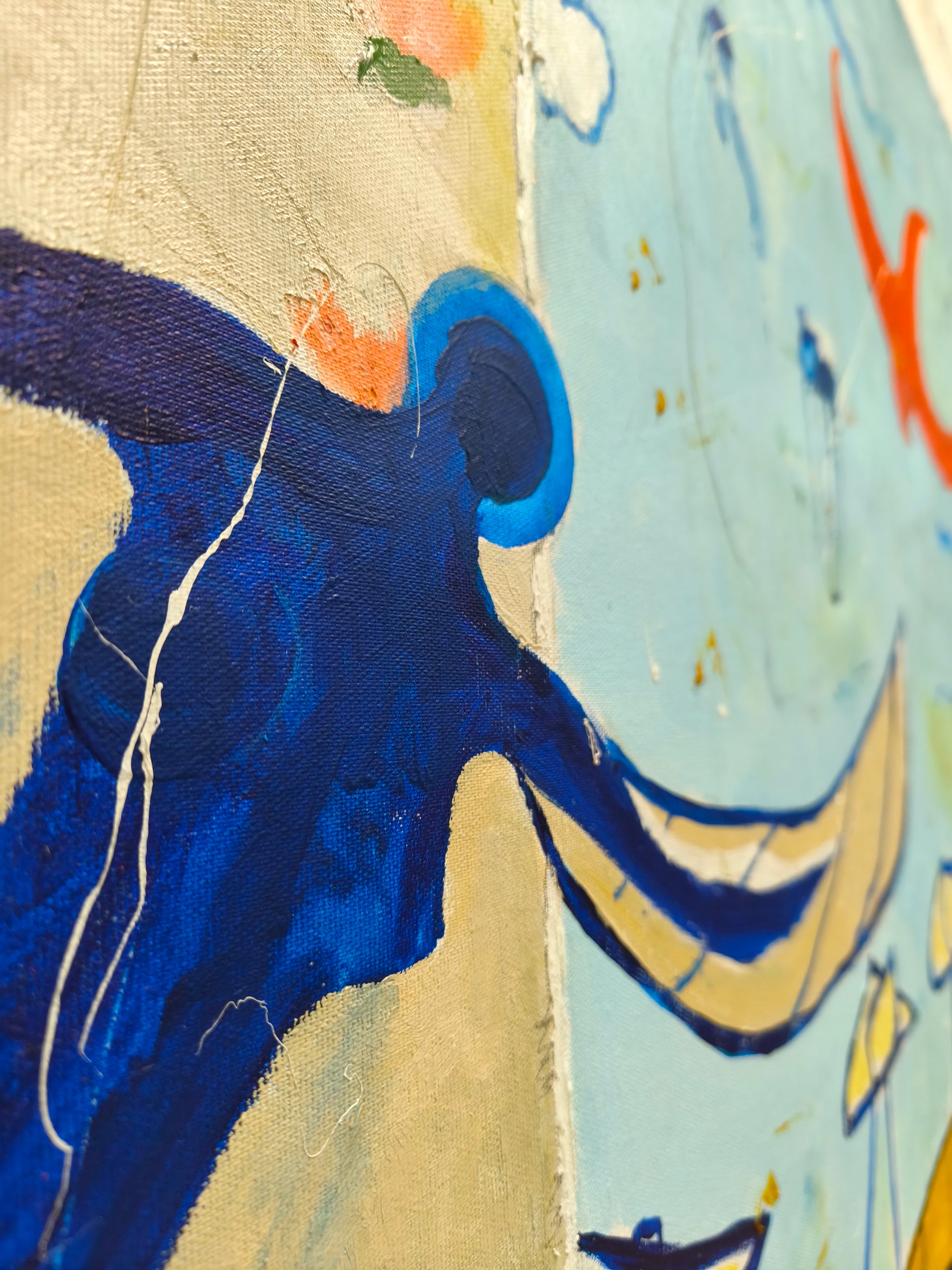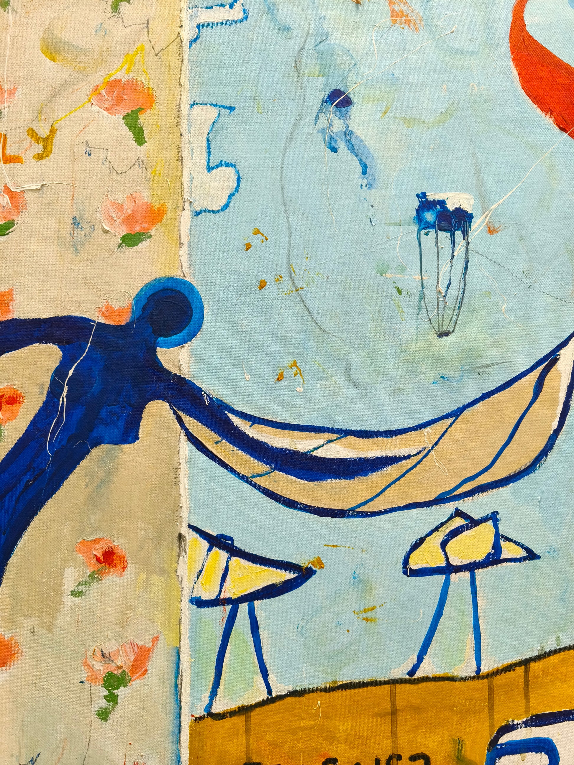 Pintura gestual, intuitiva, que deja que las cosas pasen y se apoya sobre lo que aparece. Aprovechando el accidente y aceptando las consecuencias.