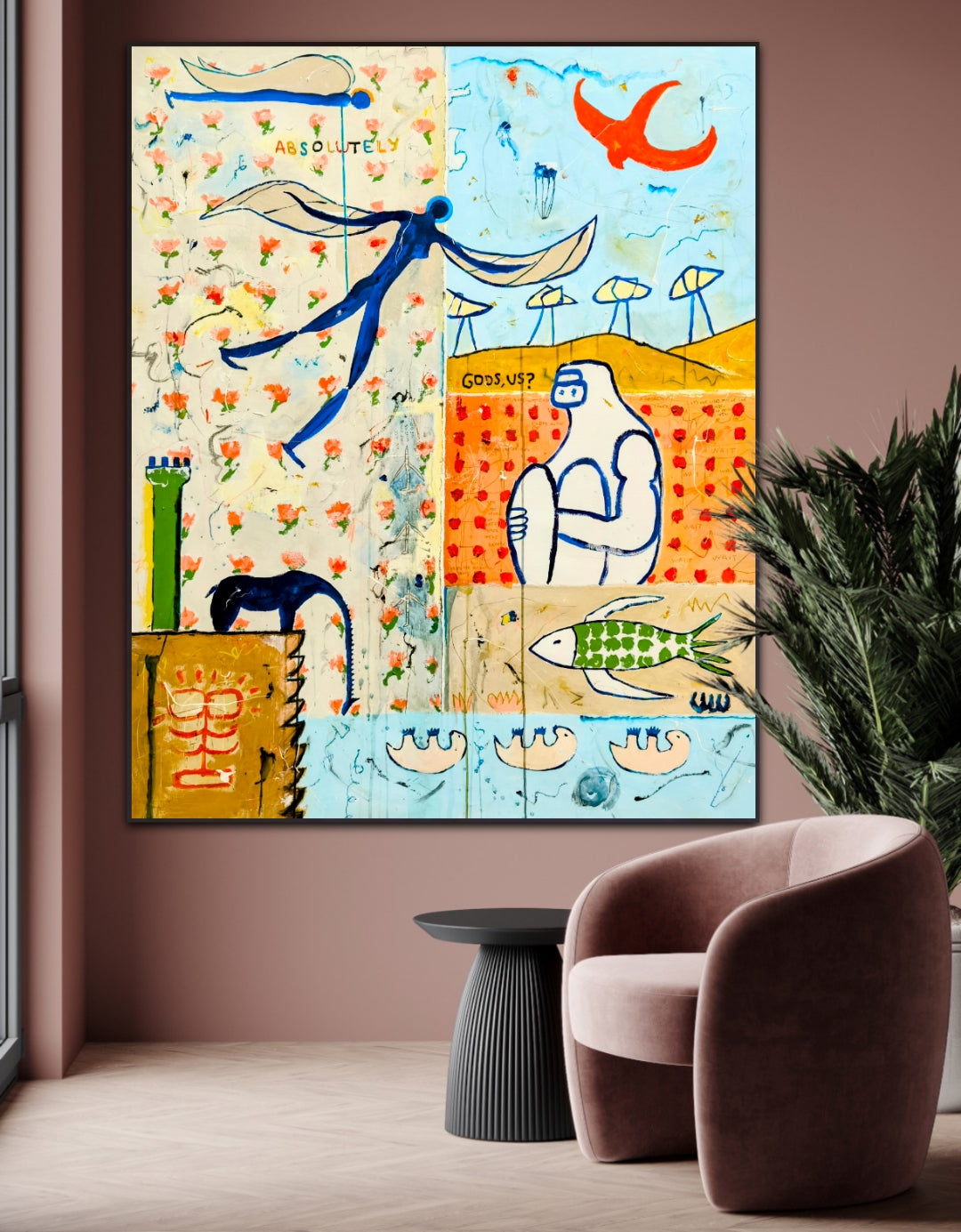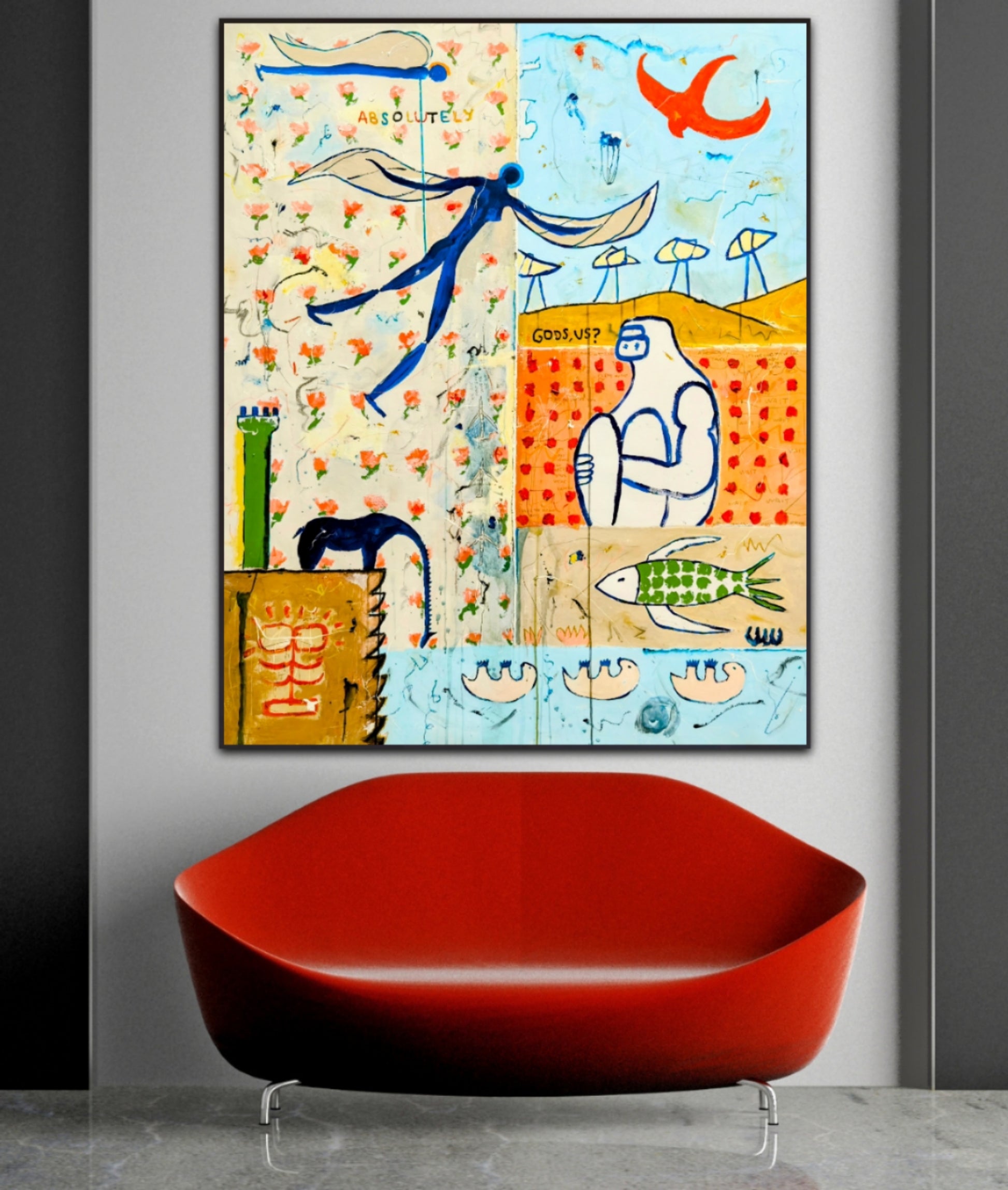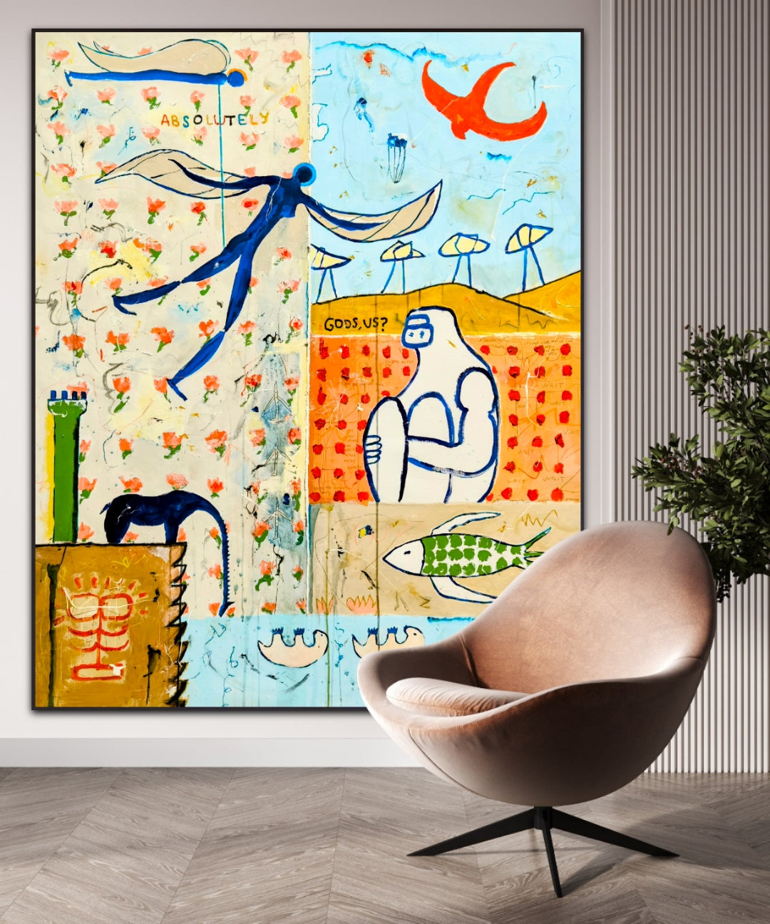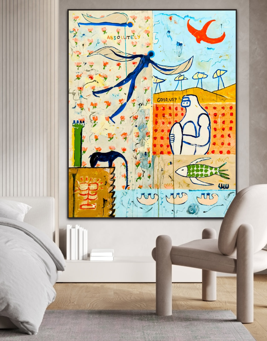 Pintura gestual, intuitiva, que deja que las cosas pasen y se apoya sobre lo que aparece. Aprovechando el accidente y aceptando las consecuencias.